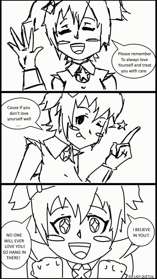 I was trying to make a comic that depicted how down I felt but then I realize I feel great and super happy so I tried to make something to remember you that the first step to be happy is to love yourself c: