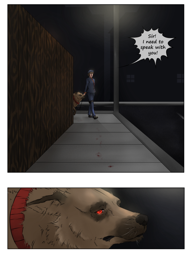 Luray is called out to by an Officer who has some questions for possible witnesses to the local crime. His companion, a German Shepherd, sees and smells the blood in the dark and gives chase.