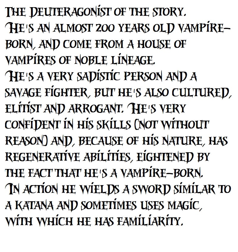 Janor is a lonely wanderer, and his name is known by some people for being a "Vampire Hunter", because he killed a large number of these beings. What most people don't know is that Janor is a psychopath who doesn't eliminate only those abominable creatures...