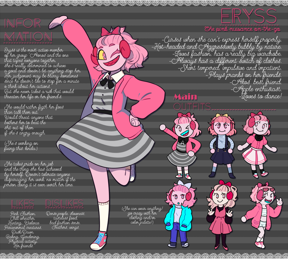 It took me a longg time to finish mostly because i was struggling to get a clear interface to fit all her info and also fit all the drawings in one pic, i gotta say it ended up kind of overloaded with information, but i love the result anyway! Some of her outfits are based on other people's drawings of her, and i modified a little her dress when i saw one of my friend's drawing of her and i INSTANTLY fell in love with those little modifications... Anyway, here she is! :D