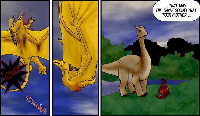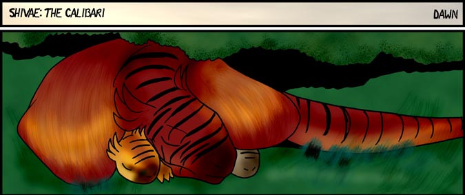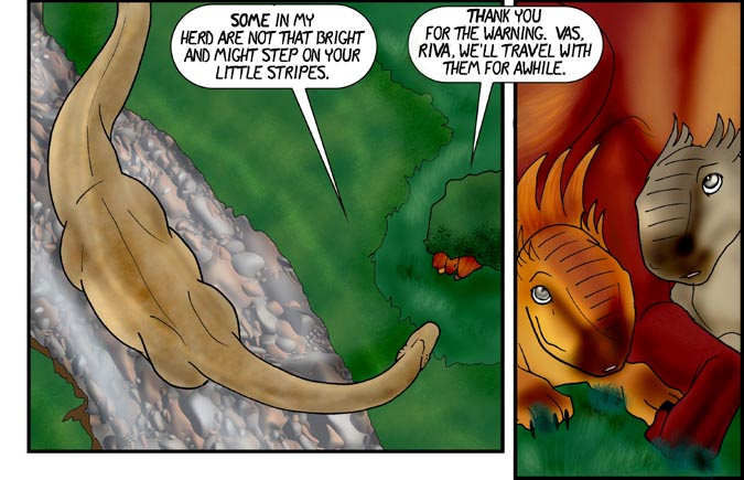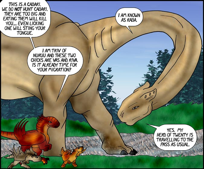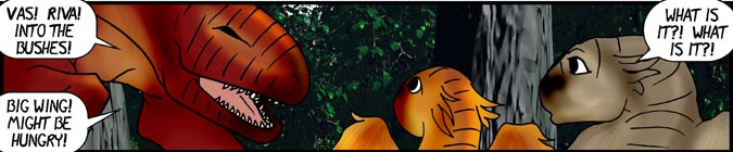 Now, Vas, is a shivae chick, a creature you can think of as a winged utahraptor if you like. They come in wingless variety too! You can also think of this as Bambi with Carnivores. Anyway, Vas has lost his mother and several of his nestmates to 'newcomers', the invading Cyantian people. Cyantians are anthro creatures who are new to their world and now, Vas, his father, Triv and brother Riva are seeking out new lands to live in, free of the invading Cyantians.