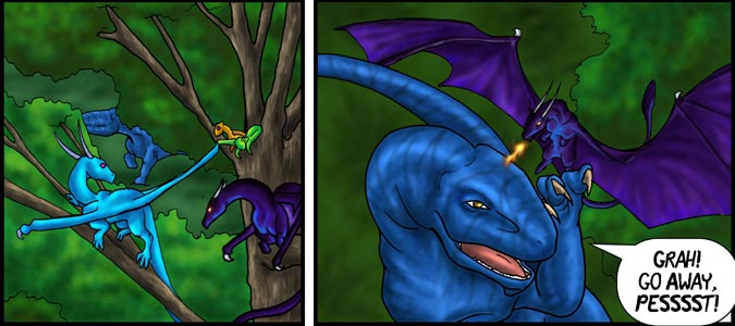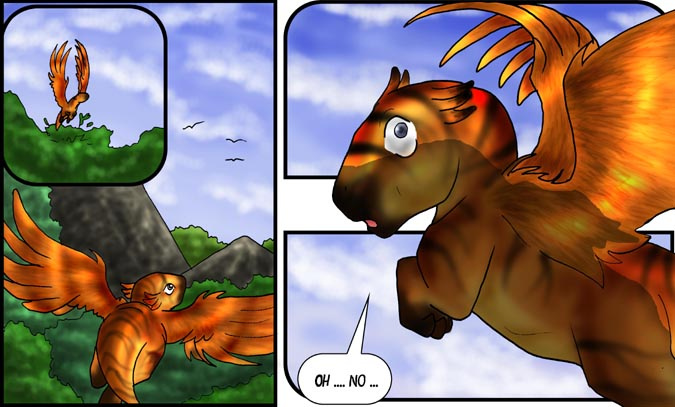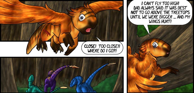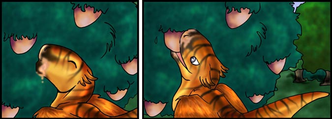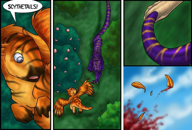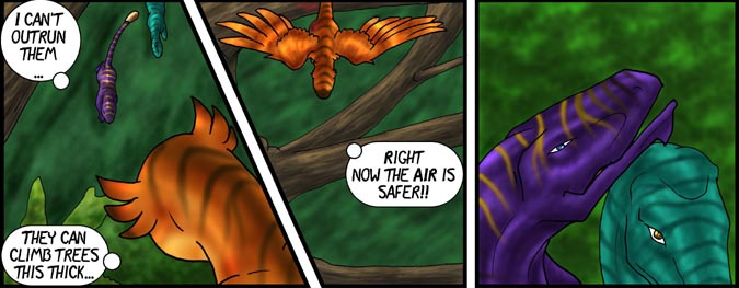 Now, Vas, is a shivae chick, a creature you can think of as a winged utahraptor if you like. They come in wingless variety too! You can also think of this as Bambi with Carnivores. Anyway, Vas has lost his mother and several of his nestmates to 'newcomers', the invading Cyantian people. Cyantians are anthro creatures who are new to their world and now, Vas, his father, Triv and brother Riva are seeking out new lands to live in, free of the invading Cyantians.