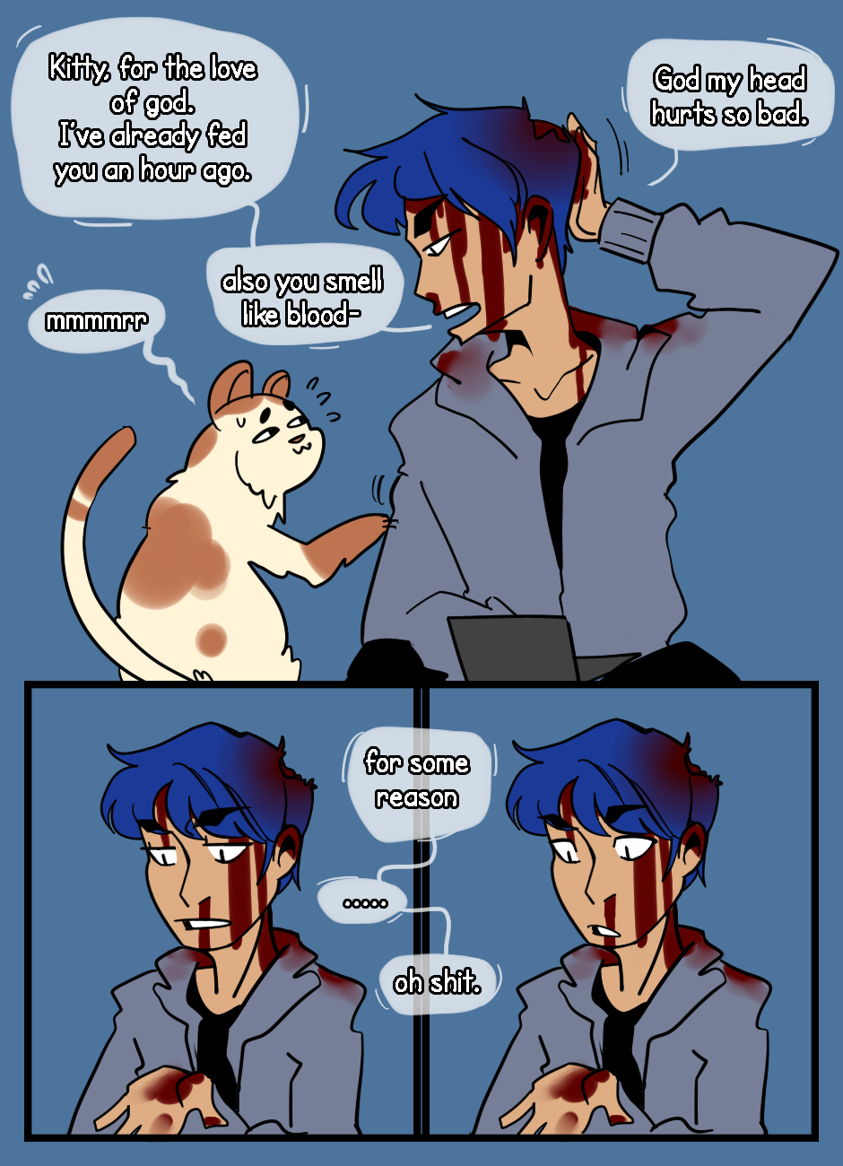 [TW: Blood] he's too lazy to think of a name for the cat.