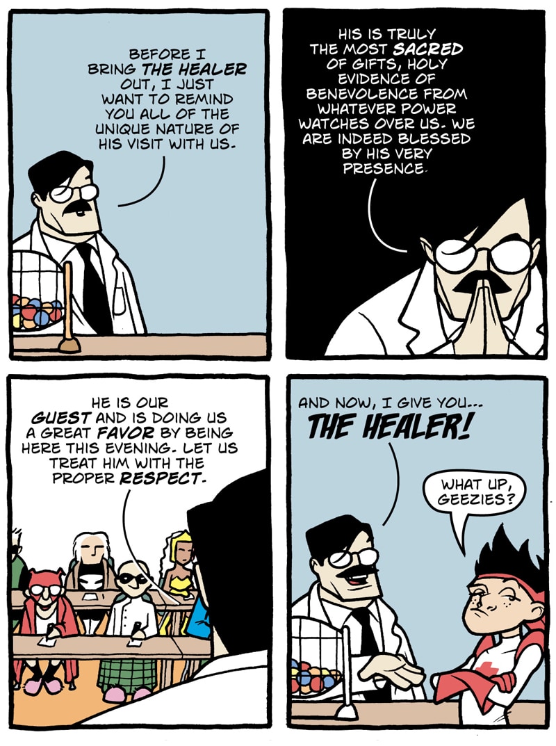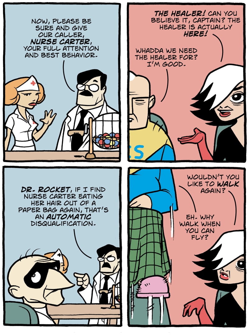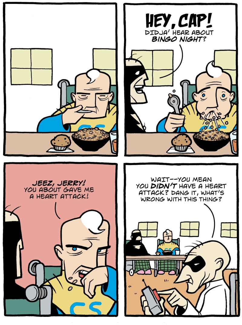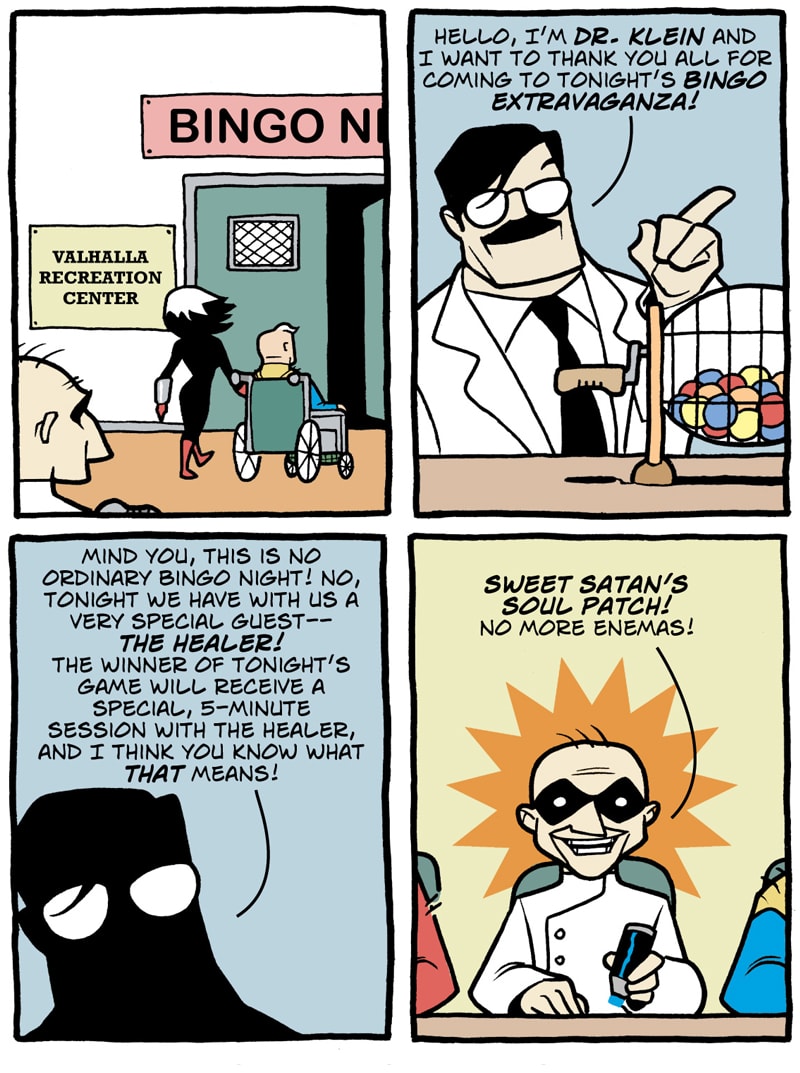 Where do old superfolk go when it's time to get out of the game? To Valhalla -- Home for the Supertired. But wait! Just when the heroic Captain Spectacular, the stealthy and sexy Spy Gal, the villainous Dr. Rocket, and the cranky speedster Swifty think they've earned their rest, new evils and terrible secrets rise to threaten everything. Created, written, and drawn by Brock Heasley.