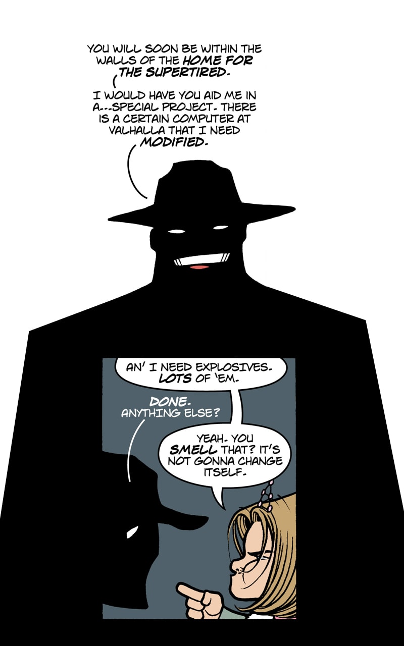 Where do old superfolk go when it's time to get out of the game? To Valhalla -- Home for the Supertired. But wait! Just when the heroic Captain Spectacular, the stealthy and sexy Spy Gal, the villainous Dr. Rocket, and the cranky speedster Swifty think they've earned their rest, new evils and terrible secrets rise to threaten everything. Created, written, and drawn by Brock Heasley.