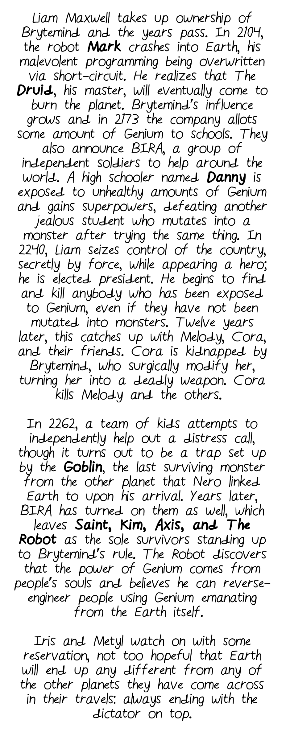 The oddball family of Saint, Kim, Axis, and the Robot bring back six beings from the past in a last-ditch effort to stop Liam Maxwell from destroying humanity in his effort to save it. Iris and Metyl watch from above, wondering if it is finally their time to step in.