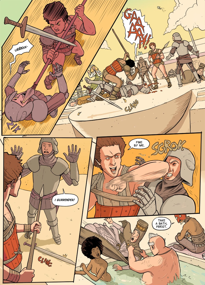 Love the composition in the panel with the dude falling towards the camera. How do you layout scenes? Like do you use physical, posable figures sometimes?