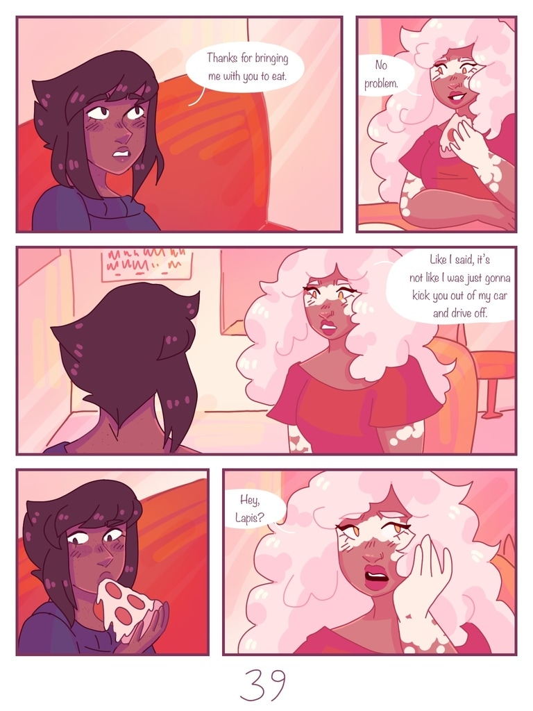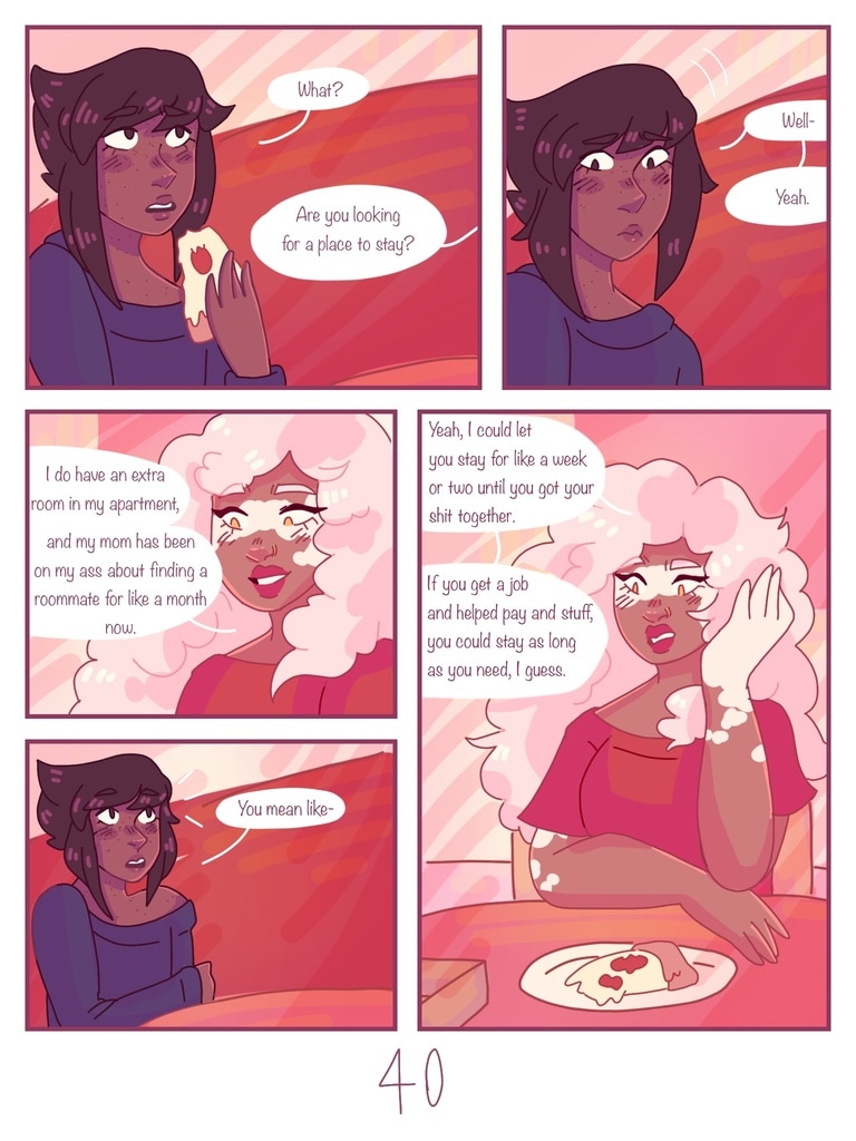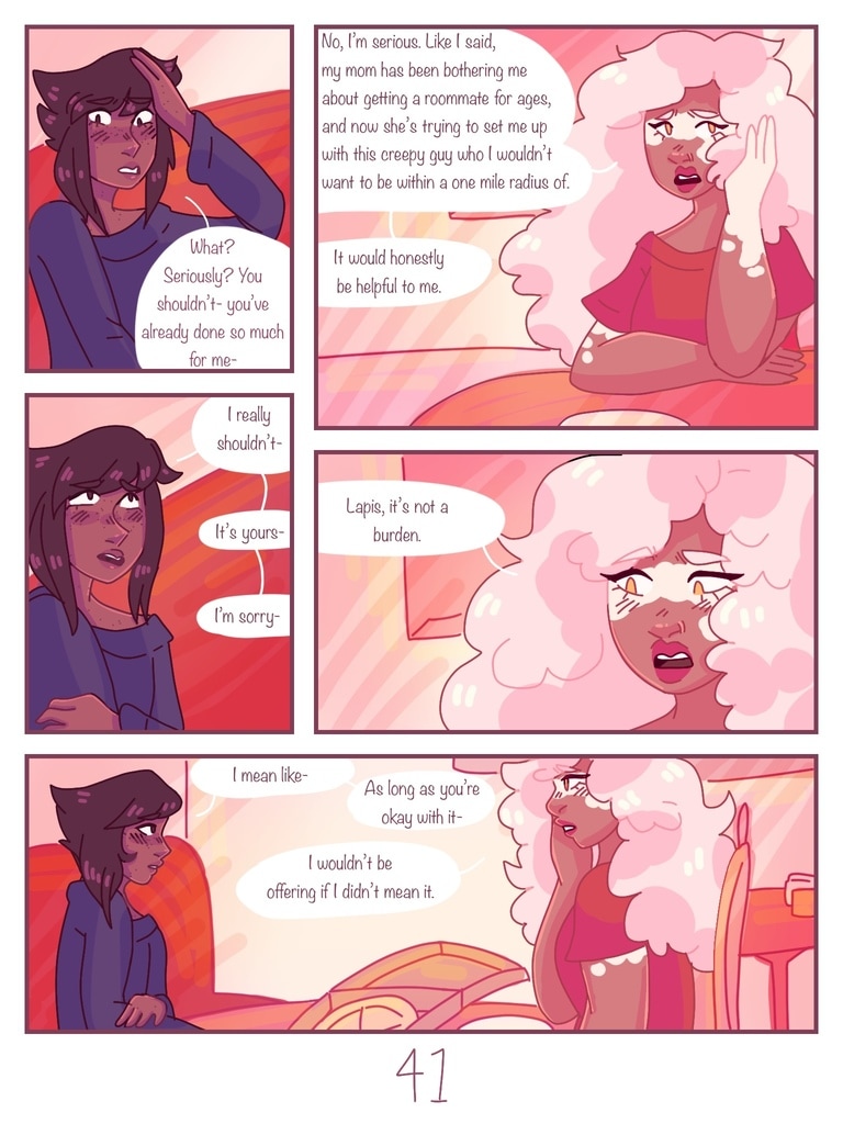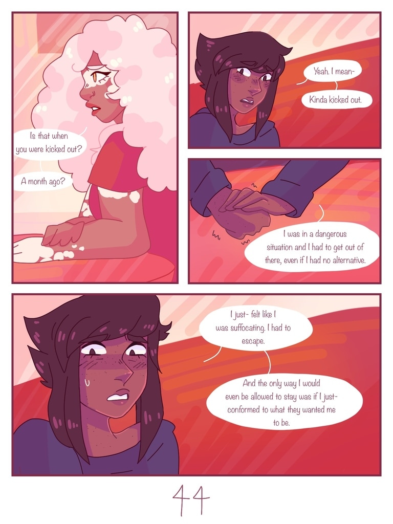 after Lapis is kicked out of her house for being trans, Jasper offers to be roommates with her, giving her a chance to start fresh and make new friends. (yes, this is a steven universe human au fancomic, but if you don't watch su you can still read it and understand the plot.)