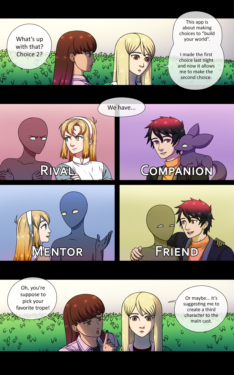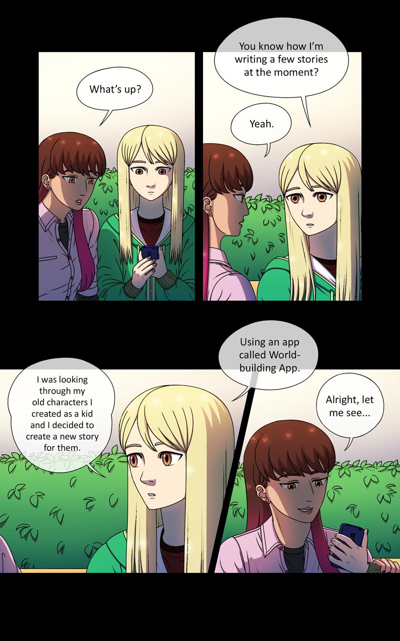 One evening Paula is looking through her old sketchbook and discovers two of her old characters. She wants to create a new story for the two so she looks up an app that might help her. She finds one called "Worldbuilding App". She starts using it, not realizing it's effects on her reality...