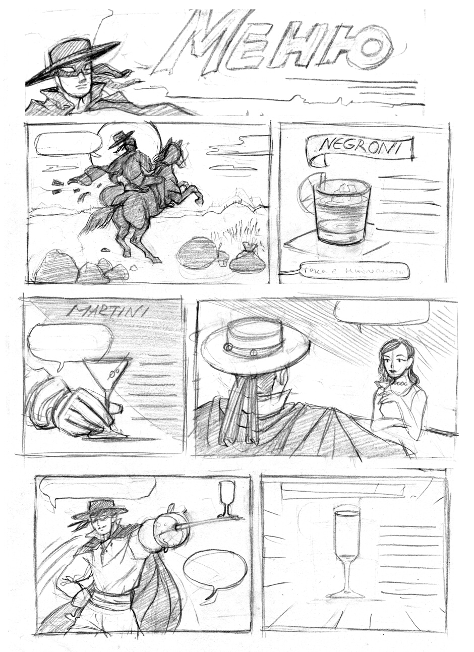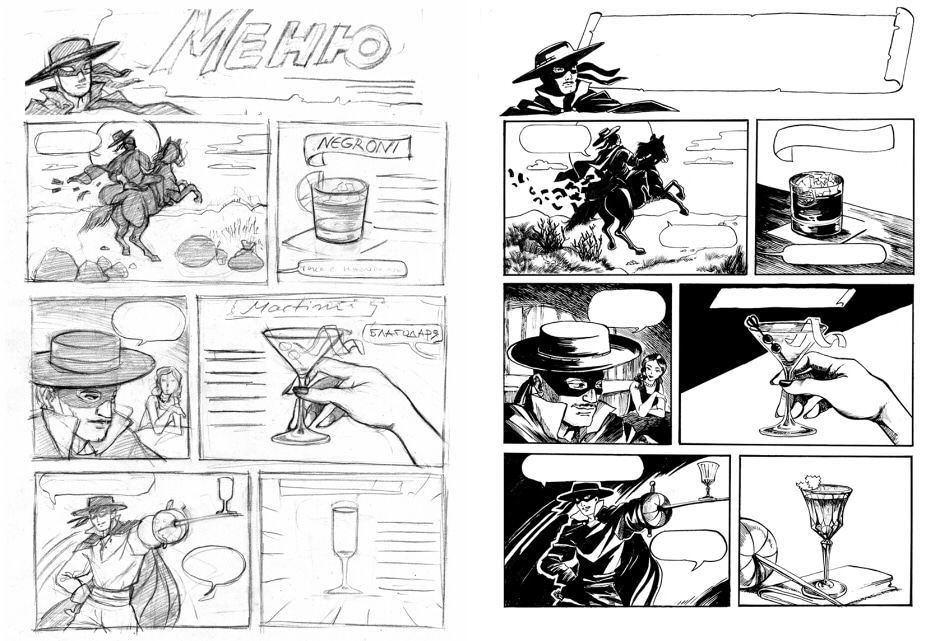 At some point I had to do a cocktail menu in comics format. I mean, how cool is that :D This is the first part of the process, with 2 small variations for the layout and the final inking. I must admit I am not really proficient in this style of inking.