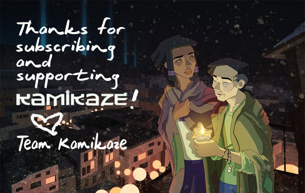 Heya Mossen! Thank you so much for subscribing to Kamikaze! We're so excited to be part of your reading list, especially since we're so new here at Tapastic. Here's hoping that you'll love Kamikaze as much as the team enjoys making it! And please, do feel free to comment! The team loves talking with our readers!