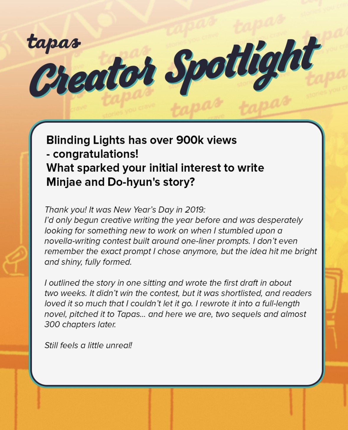 Ahh Blinding Lights is still steadily inching towards 1M reads <3 It was always my distant dream, all the way from the start, and to think we're now so close I can almost taste it...