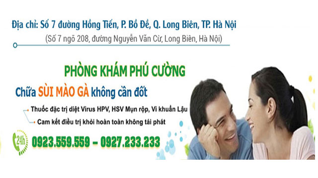 Phòng Khám Phú Cường khám & điều trị hiệu quả bệnh lây đường tình dục: chữa sùi mào gà bằng thuốc kháng virus không cần đốt, bệnh lậu mủ, mụn cóc sinh dục, mụn rộp sinh dục, viêm phụ khoa uy tín tại Hà Nội. Với đội ngũ y bác sĩ nhiều năm kinh nghiệm tại các bệnh viện lớn, chúng tôi có liệu trình điều trị khỏi và cam kết bảo hành miễn phí cho quý vị.