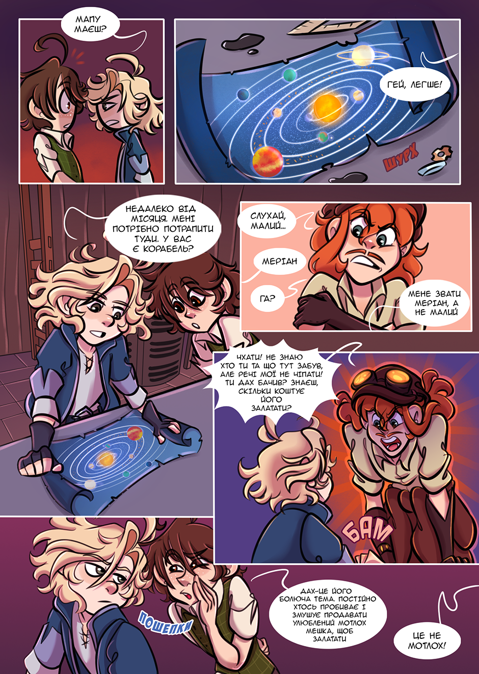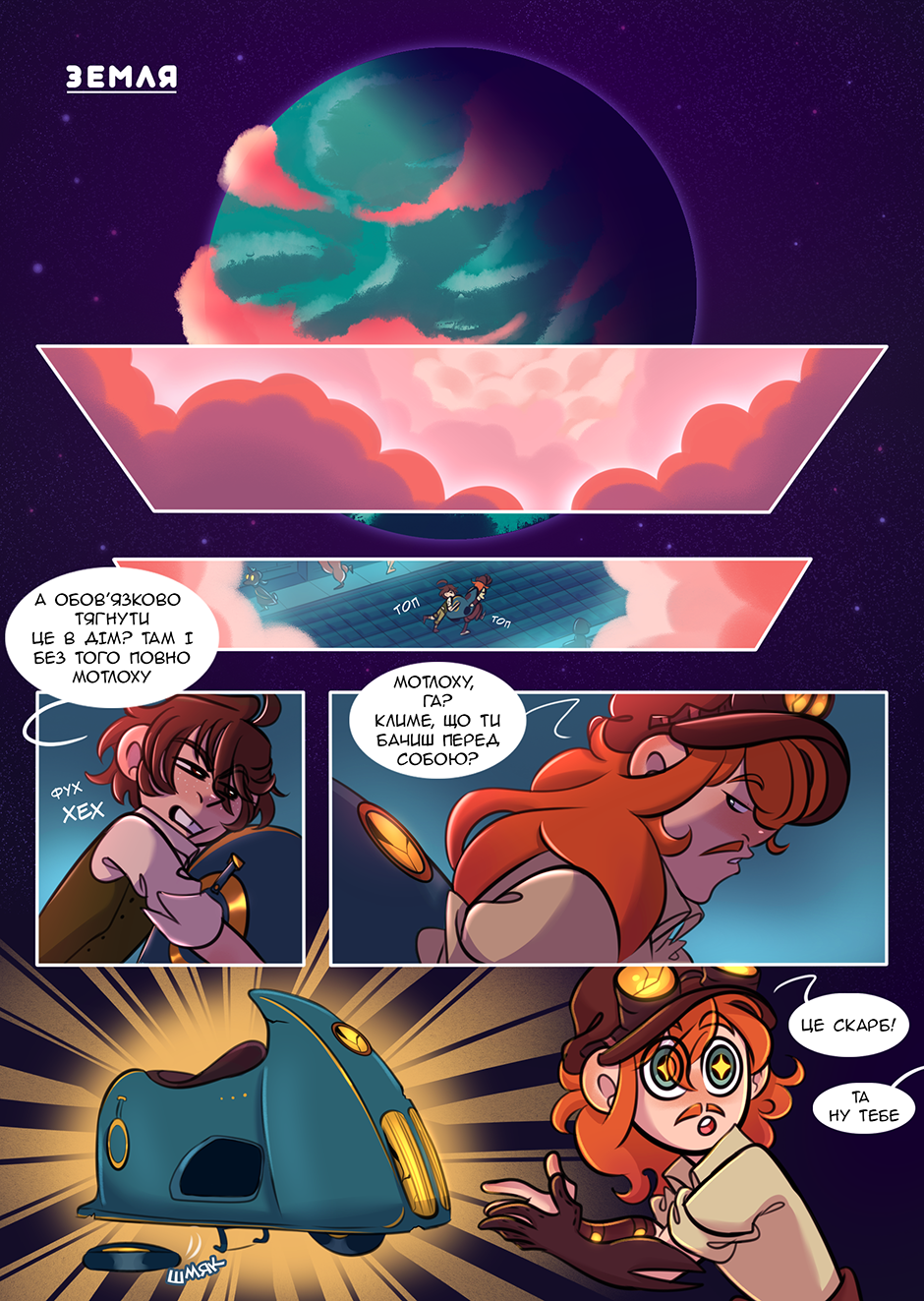 Динаміка Мешка та Клима мене дико виводить на сміх, бо вони реально дуже потішні разом. Ще коли кадр показує розвалючийся мопед (?) по який Мешко каже що то є скарб, підпис "Шмяк" мене просто виніс, і я навіть не знаю чому.