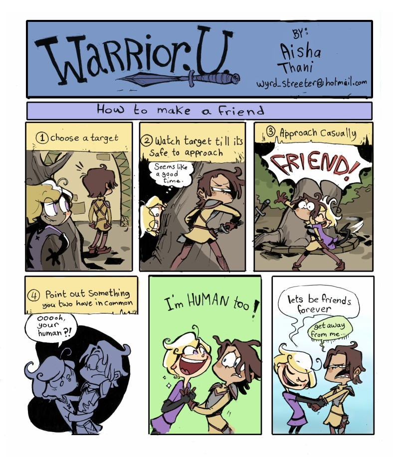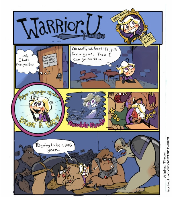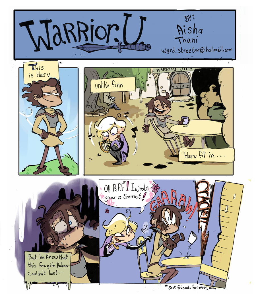 Warrior U follows the adventures of Finn, a small, effeminate, unruly young lad, and his rise to, almost unachievable, manhood. He WANTS to take a course on becoming a bard, but instead ends up, like so many of us do, in a completely unrelated class that he HAS to pass if he wants to get anywhere. That class is warrior class where he befriends the reluctant Harv.