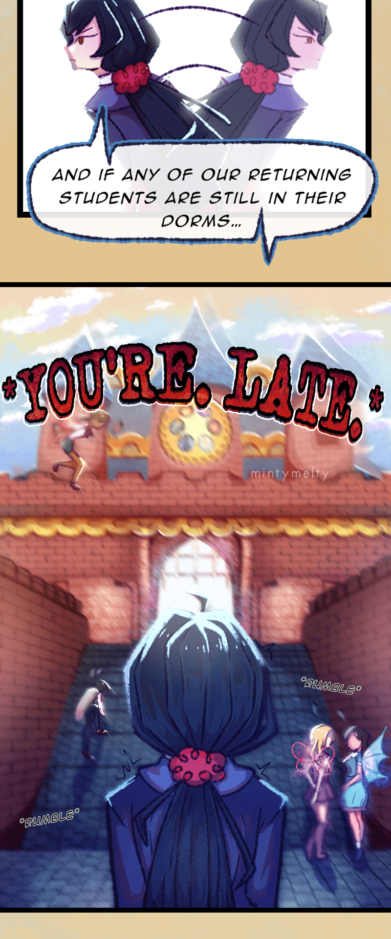UPDATES EVERY FRIDAY [] Welcome to Divinia High, a school full of magic! Our protagonist, Chizuru, is completely incapable of magic and must navigate a world hostile to her existence. Join Chizuru (Act First, Think NEVER!), Ares (Short “King” w/ Theater Kid vibes), Leila (Geek-a-Tron 5000), Rosaria (The Best person you’ll ever meet), and… Elio (The WORST) on their misadventures through Divinia High and discover the mysteries of the Six Sovereigns…