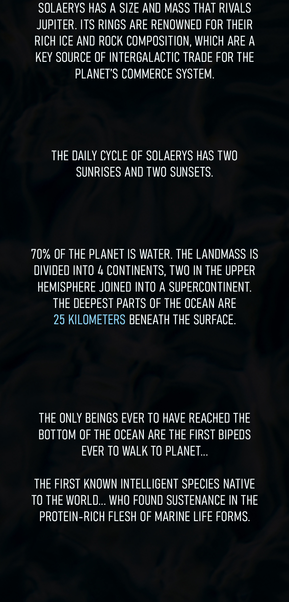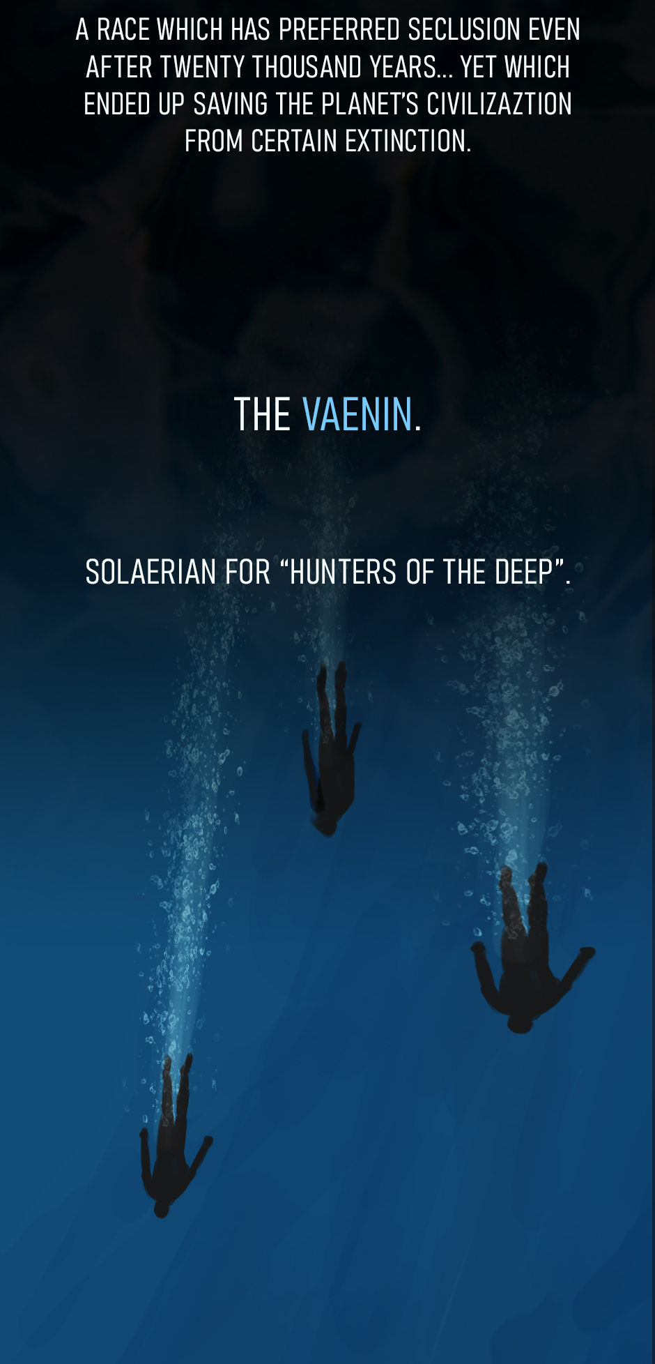 25 years ago, the mass-killing virus "Carcinoma Valaroma" swept across the planet Solaerys. Dr. Siggenfir inherited the source of a 'cure' from an acquaintance, member of an ancient race known as the Vaenin (Solaerian term for "depth hunter"). In the present day, Dr. Siggenfir's daughter Eliz'a, the new Medic Prime-in-training, has been relayed the torch, now that the virus has resurfaced.