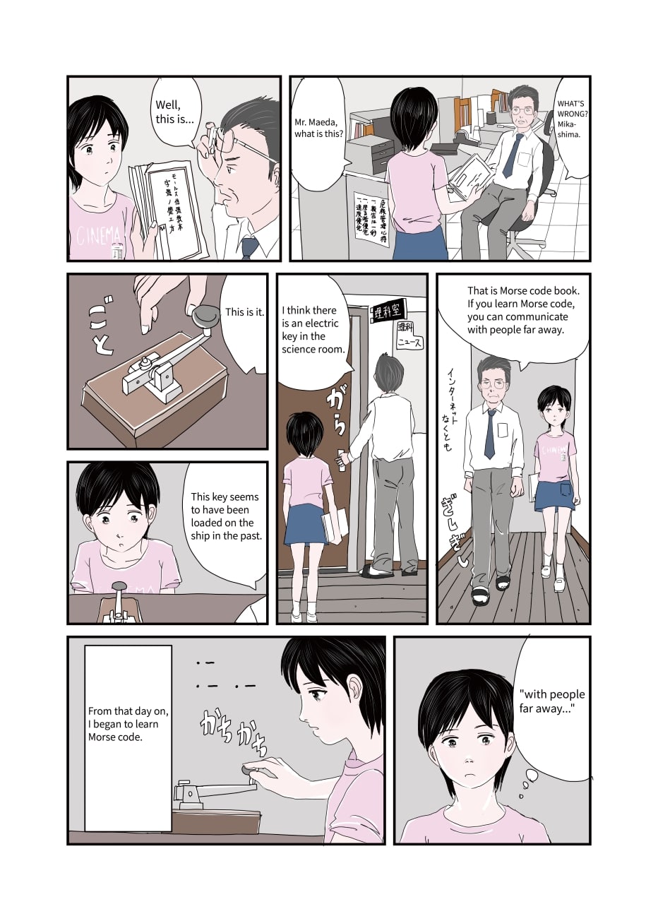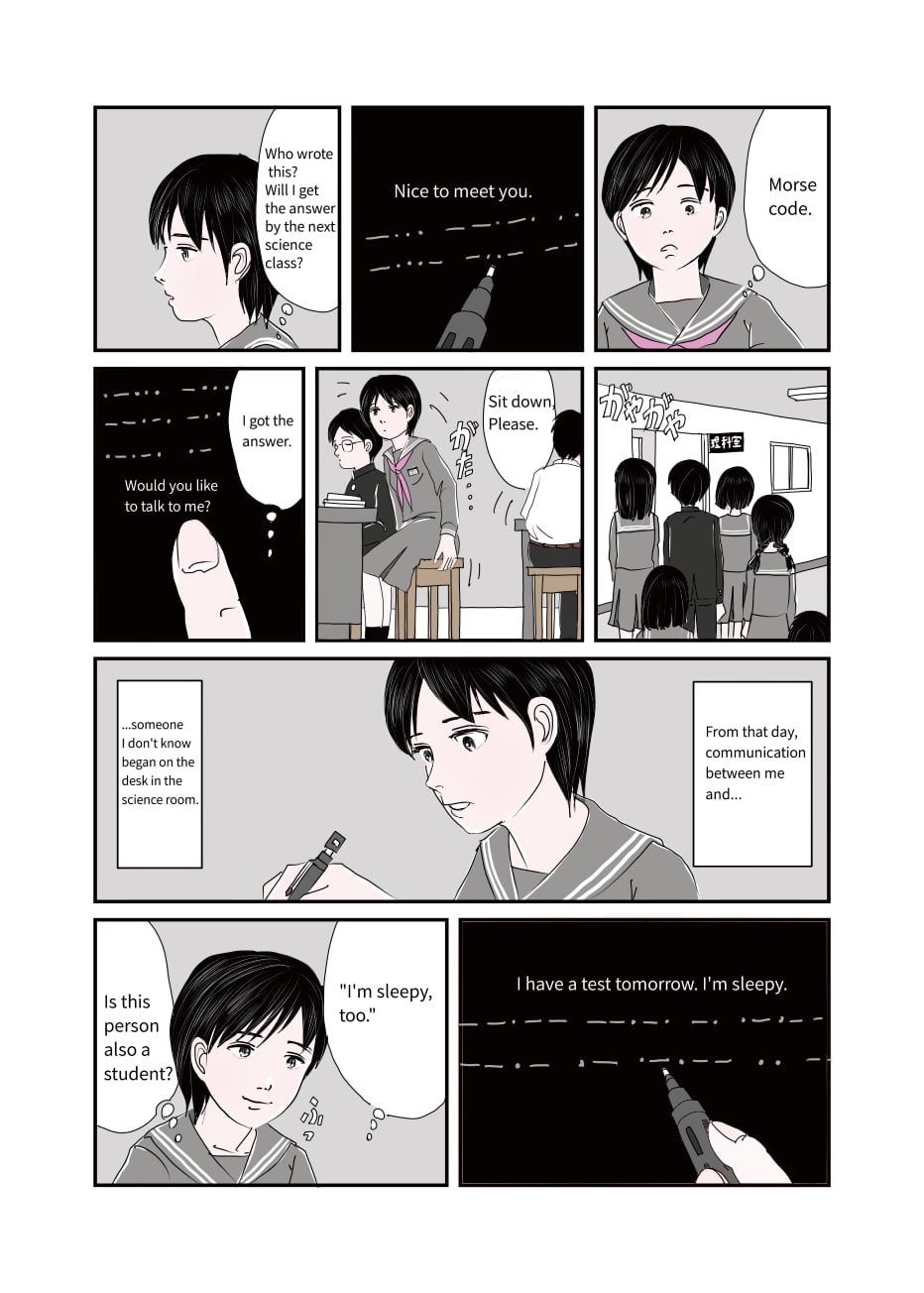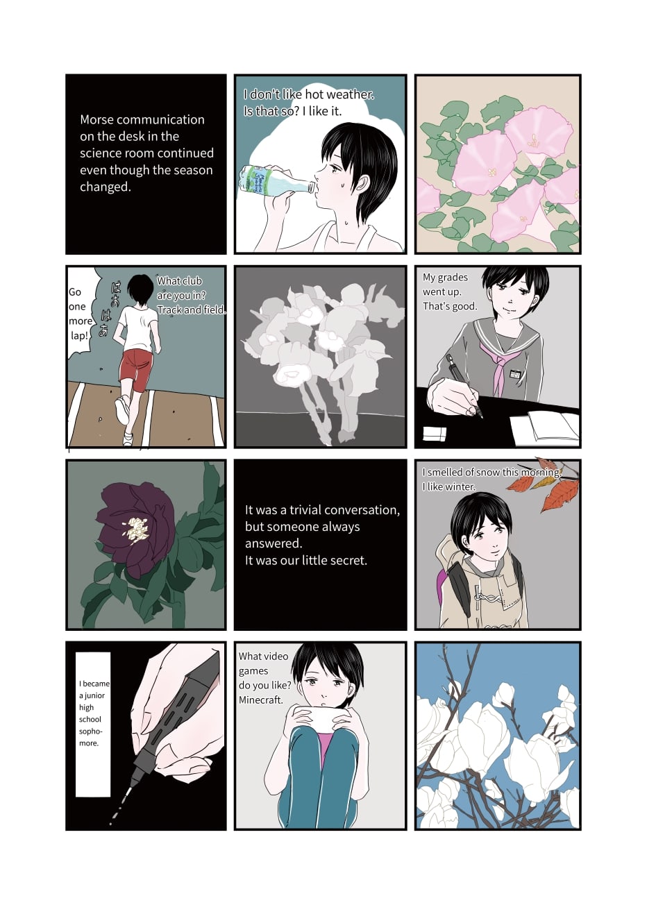 The protagonist is a lonely girl. She found a Morse code instruction on a deserted boat, after that, she started receiving Morse code communications from an unknown source. However, there was no communication, and the girl sent a final Morse code to an unknown person toward the sea on the winter of college entrance exams. At that time, she received a reply from the sea saying, "I'm doing well.".