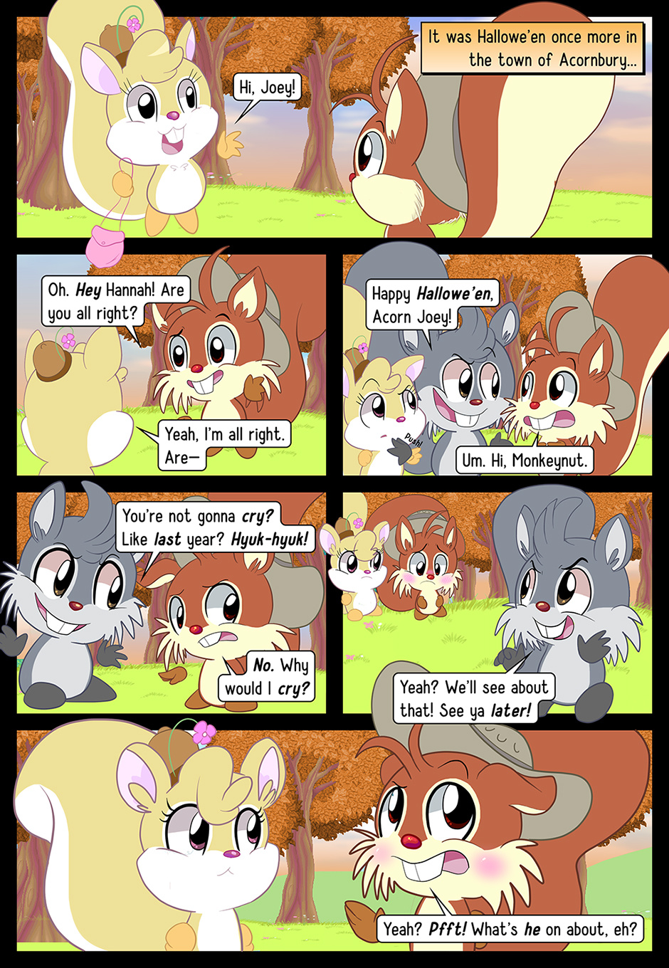 Welcome to Acorn Joey: Trick-or-Treat. The tale is that of a bright, young spark of a squirrel named Acorn Joey—oh so deathly afraid of Hallowe'en, whilst so keen to prove himself his lady love. Will he face up to his fears? Will he overcome his nightmares? Or will he cry again, like last year? There is but one way to find out…