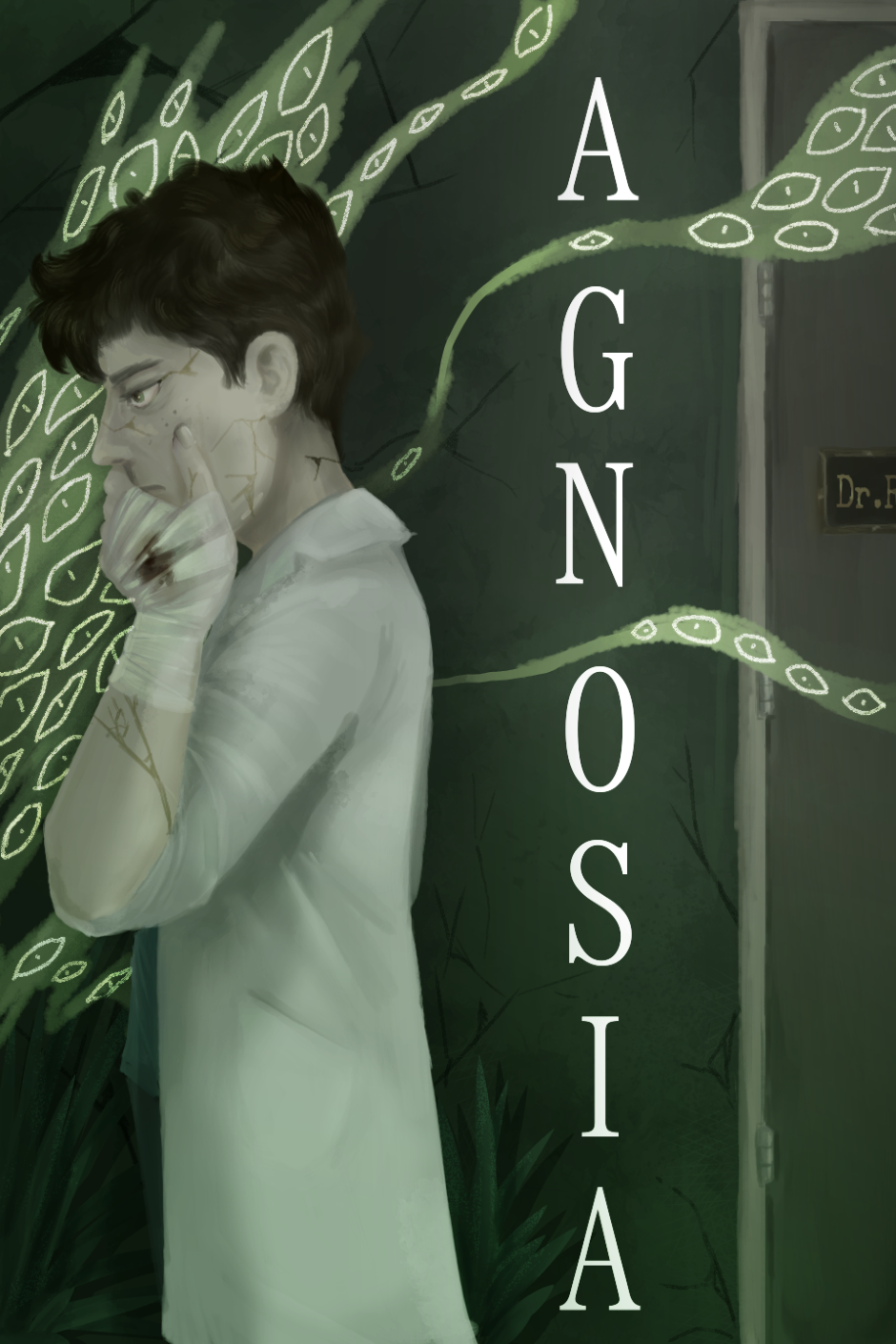 *Image description: Cover for the comic, with the title, 'Agnosia' in white, vertical text, with a faded greenish background. The subject is a character wearing a white doctor's coat and a pensive expression. A placard on their door confirms they are a doctor, but nothing else can be seen of the room. Their eyes look tired and red, their hair is dark brown. Their left hand, brushing their face, is bandaged, with fresh blood stains. They appear haggard upon first impression, but with closer inspection there are faint cracks across their skin, and the walls behind them. There is a surreal green mass with light eyes leaking across the background. Something is clearly wrong.*