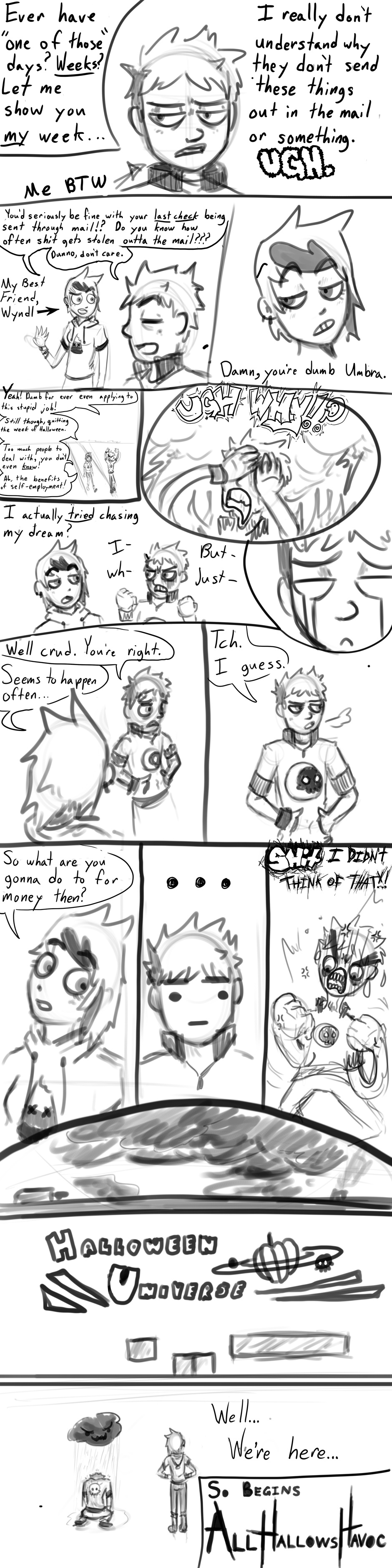 Umbra Hallow quit his job at the Halloween superstore; Halloween Universe. He and his best friend, Wyndl Eve go to pick his last paycheck up only to find that something strange has happened.