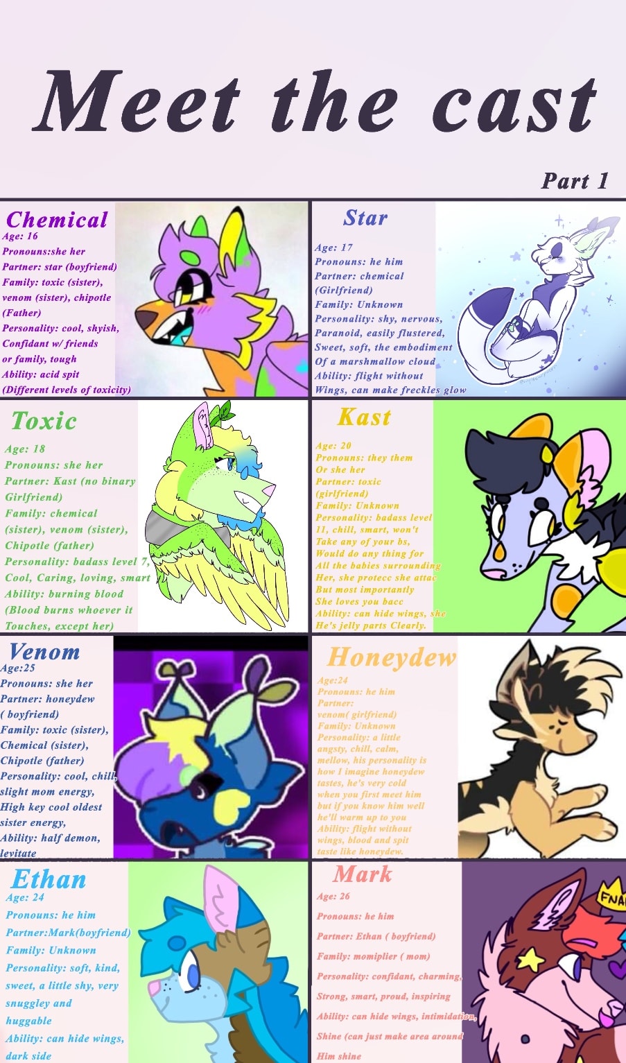 I tried to make this serious but I can't. Basically a depressed 16 year old with daddy issues. A bunch of stuff goes down. This series has some sensitive content such as abuse, self harm, ect. So If you're sensitive or like 12 or something just don't read it. I love all my characters dearly, I've spent countless hours developing personalities and designs and relationships for each of them. They're like my children.