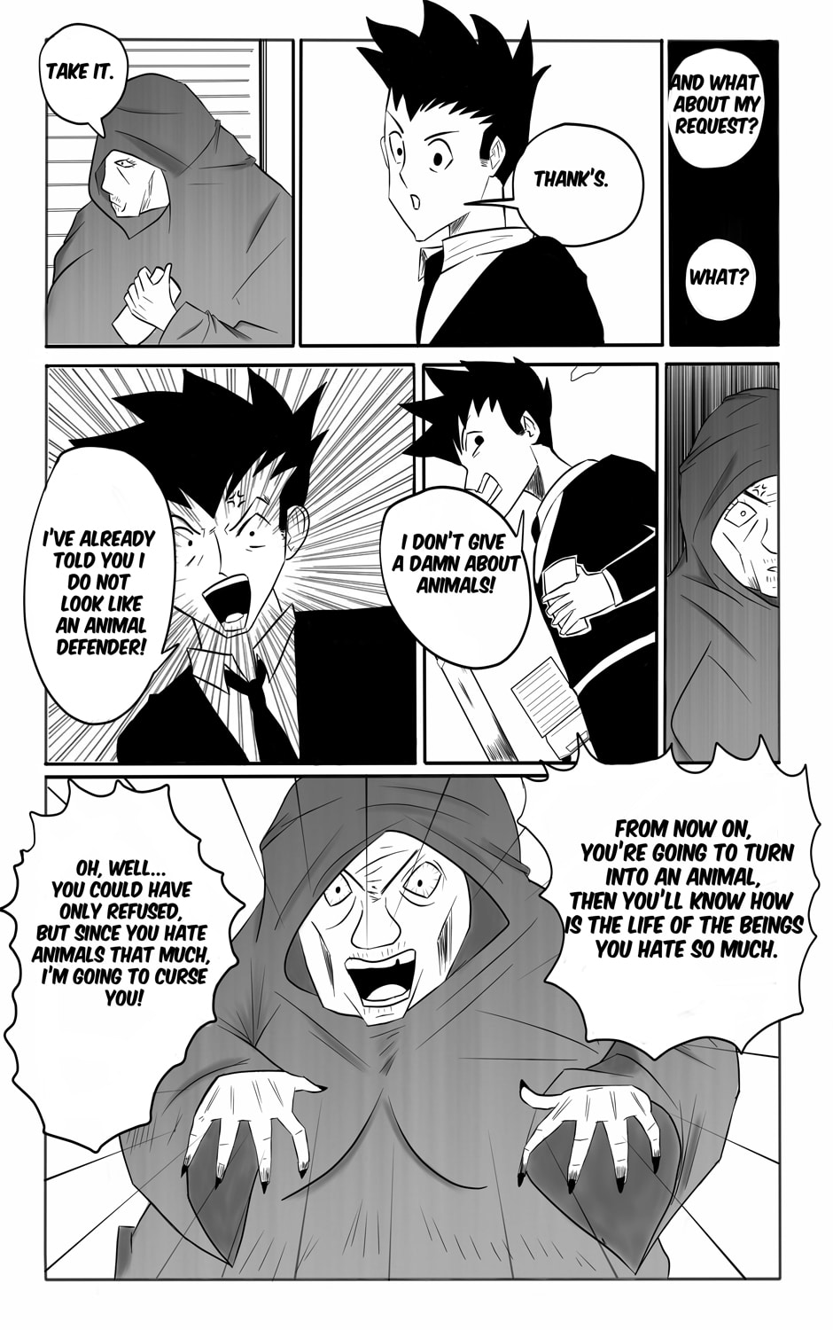 A man who hates the animals is cursed by a mysterious old lady who transformed him into half human, half animal.