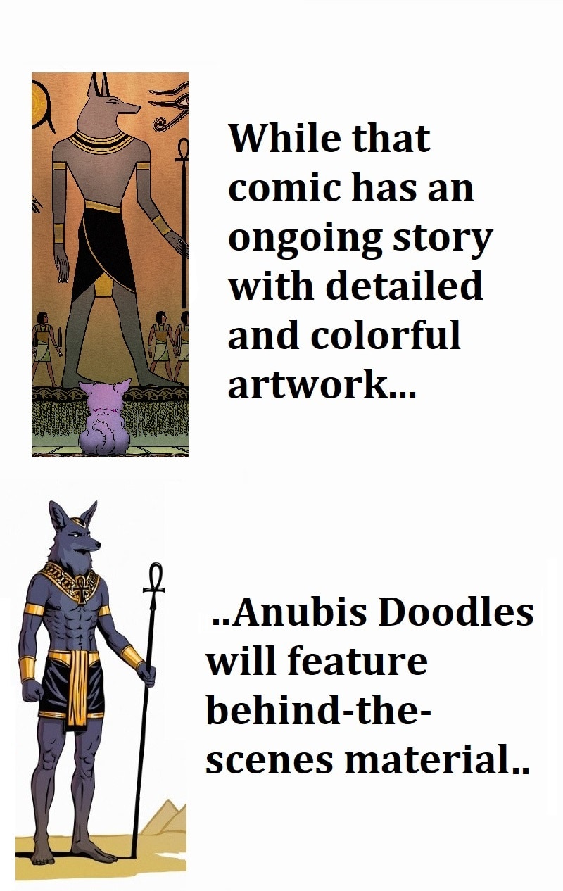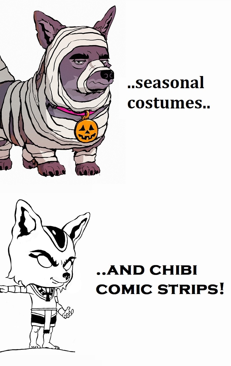 This can range from behind-the-scenes content, to chibi comic strips, to Anubis The Dog being dressed up in various different costumes.