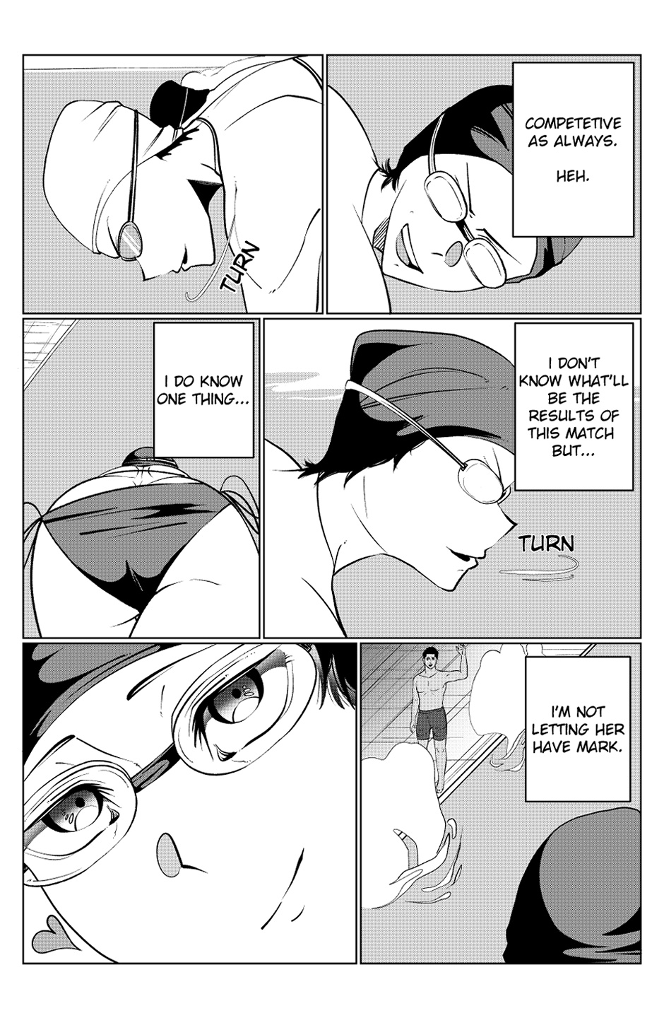 The swimming competition between Bon Hwa and Maddie begins. Mark watches from the edge of the pool. Who will have the better start?