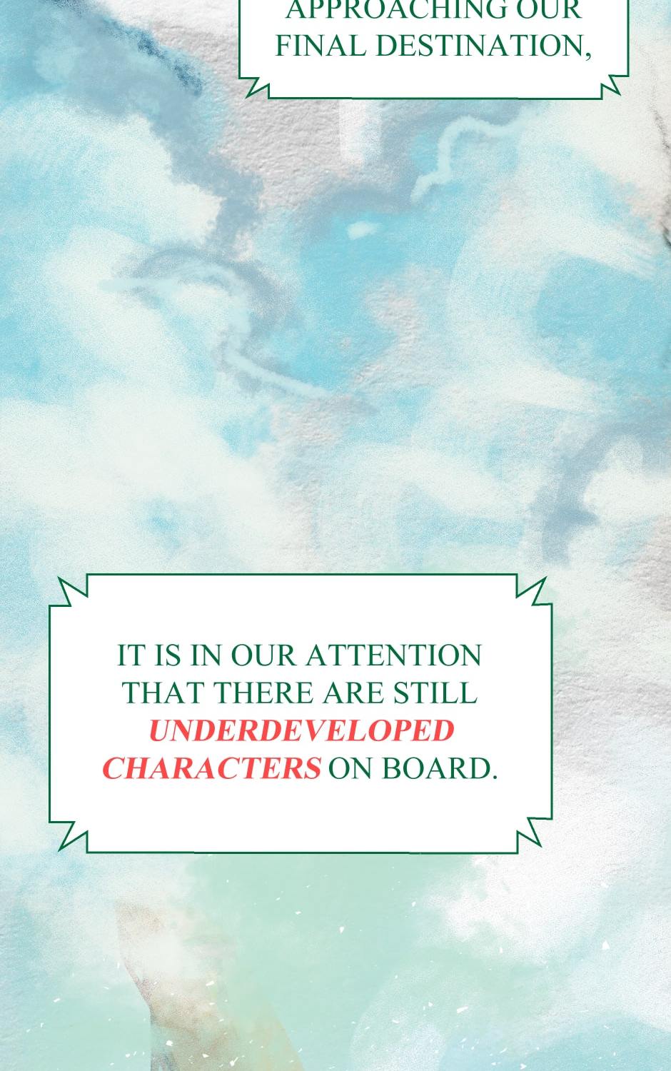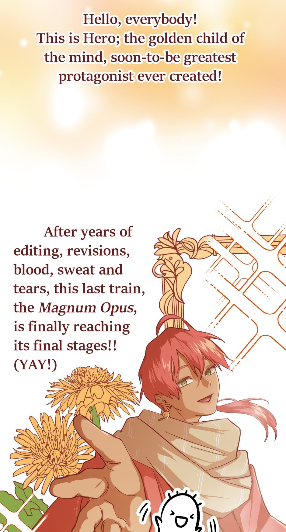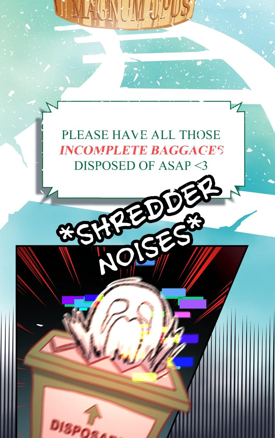 On board the train of thought, the Magnum Opus, two friends make their way to the story's final stages—until Hero discovers that his best friend's existence is in violation of the train's arbitrary terms and agreements?! Will the hero be able to protect his friend from getting scrapped…?!!