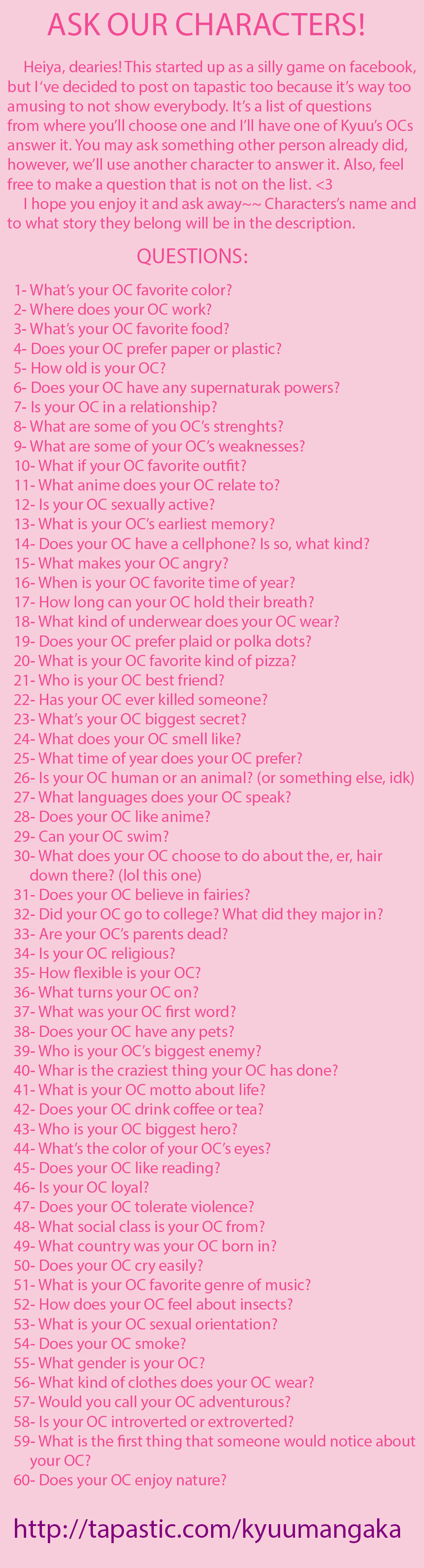 Just a silly place where you can make questions to our original characters. <3 The answers will mostly be in sketches, though.