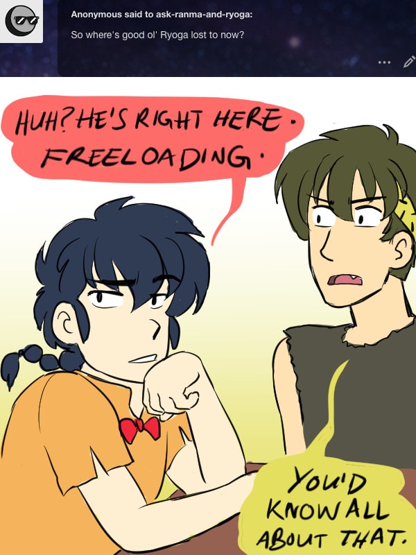 A Ranma 1/2 ask blog/webcomic where the plot is driven by your questions! Join the boys as they battle through the zaniness of everyday life as teenage martial artists—dealing with monsters, magic (anons), and a few awkward attempts at romance. Updates Sundays!