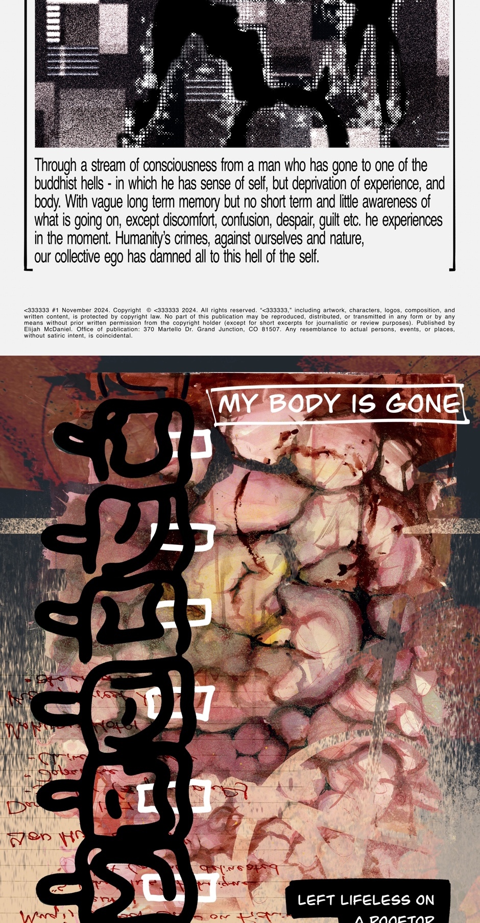 Through a stream of consciousness from a man who has gone to one of the buddhist hells - in which he has sense of self, but deprivation of experience, and body. With vague long term memory but no short term and little awareness of what is going on, except discomfort, confusion, despair, guilt etc. he experiences in the moment. Humanity’s crimes, against ourselves and nature,