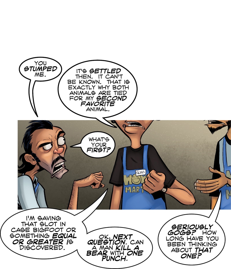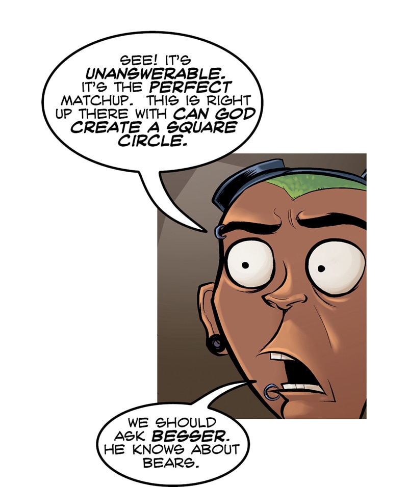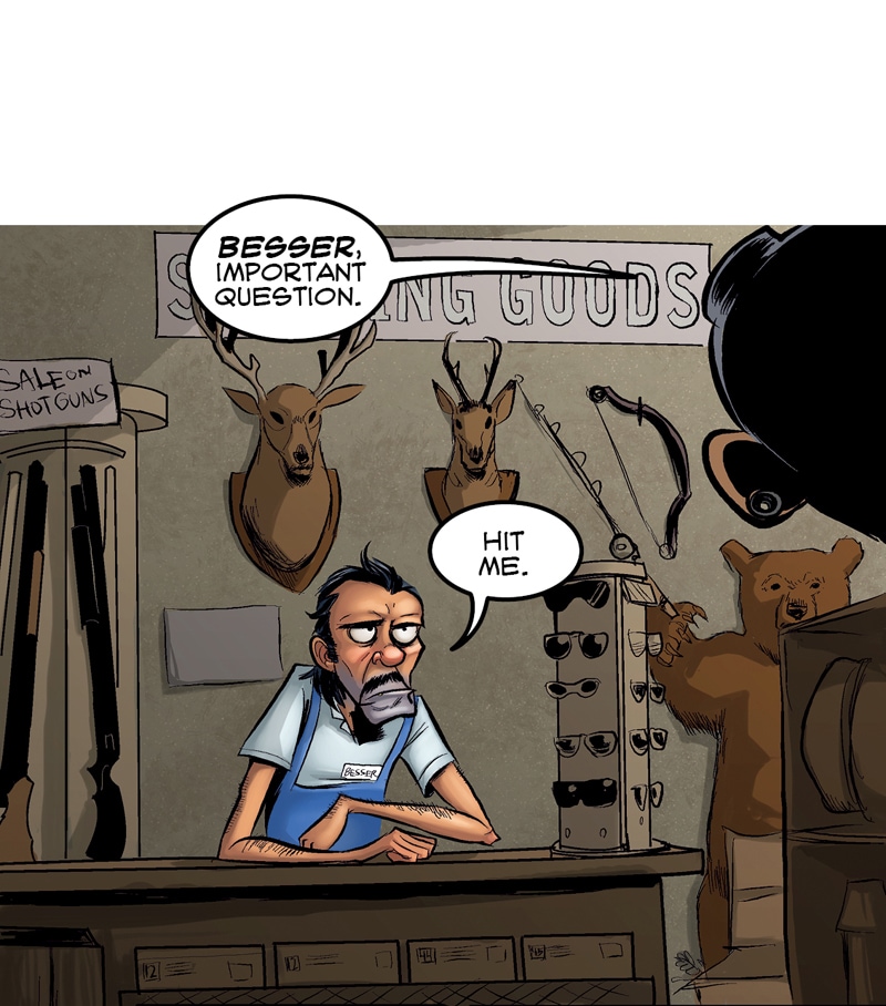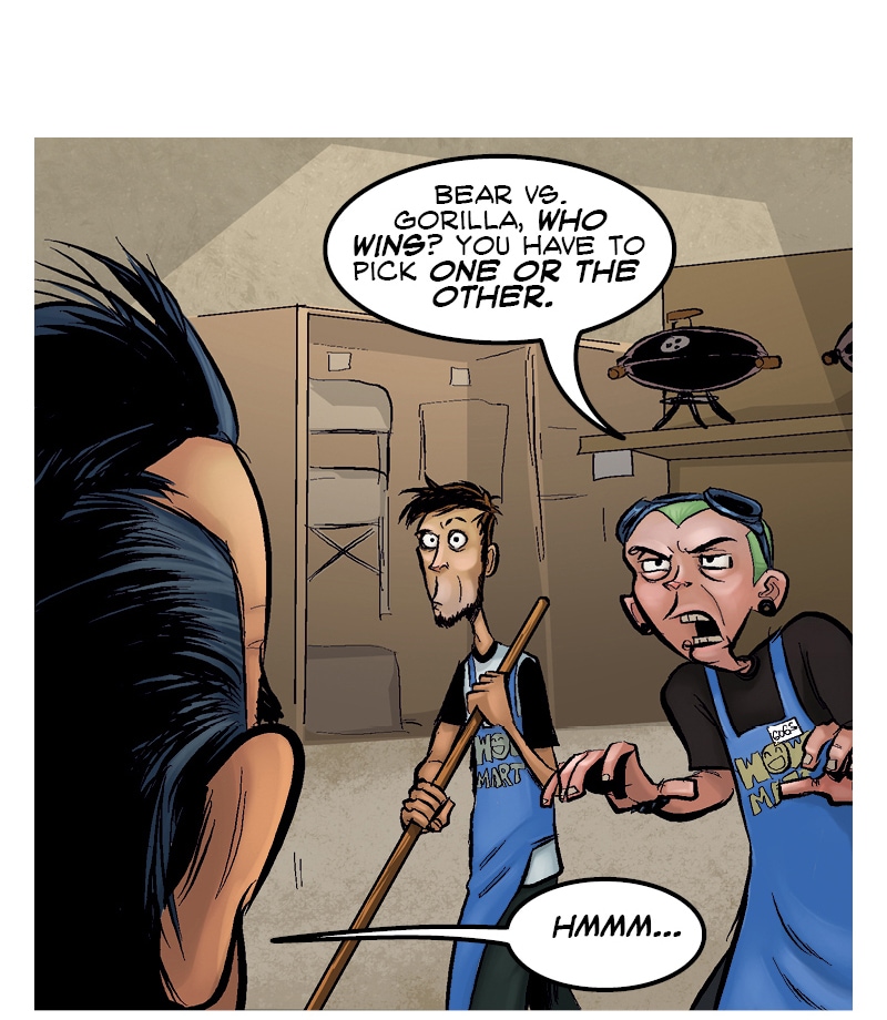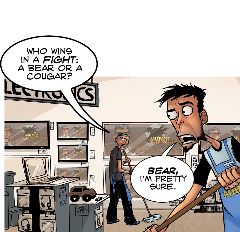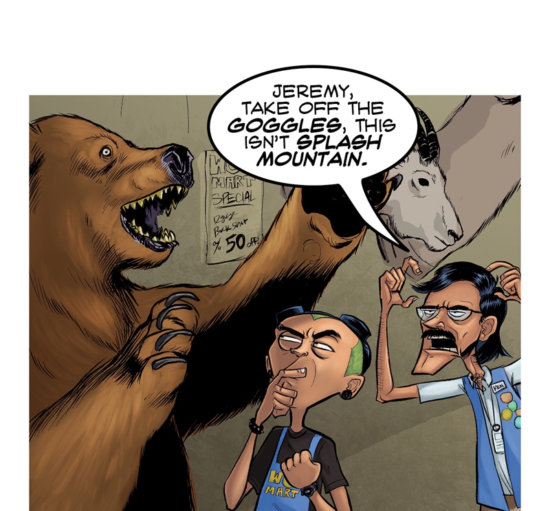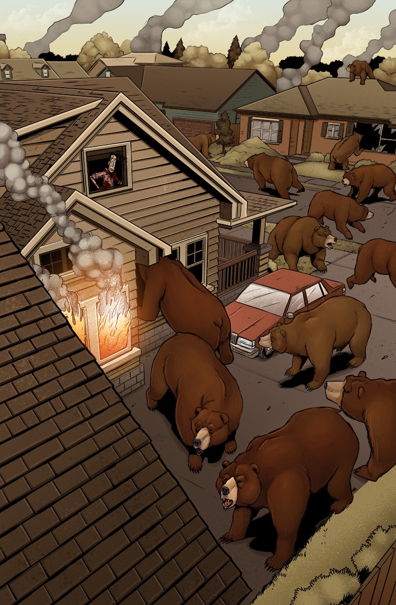 BEARS HAVE DECLARED WAR ON ALL HUMANS From Axe Cop creator, Ethan Nicolle. When Wow Mart employee, Joel Morley and his slacker friends ditch society to live in the forest, they discover a mass exodus of bears heading back to civilization to declare war on mankind. They enlist the help of a half-feral mountain man to aid them in returning to the city to find their families. But With bears mutating, growing tentacles and invading en masse, it looks like the end of the world is coming.