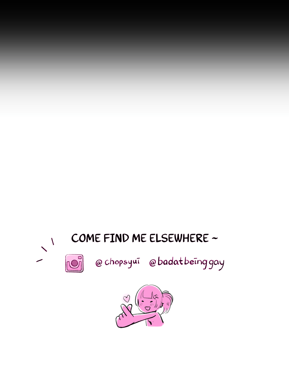 hi reader ♥︎ yui here! thank you so so much for reading the epilogue of Bad at Being Gay. making this series pulled me out of my longest, darkest art block to date- and I'm grateful to be here sharing this comic with you. if you so wish, please stay updated with BABG by subscribing to the series, or following me on my socials!