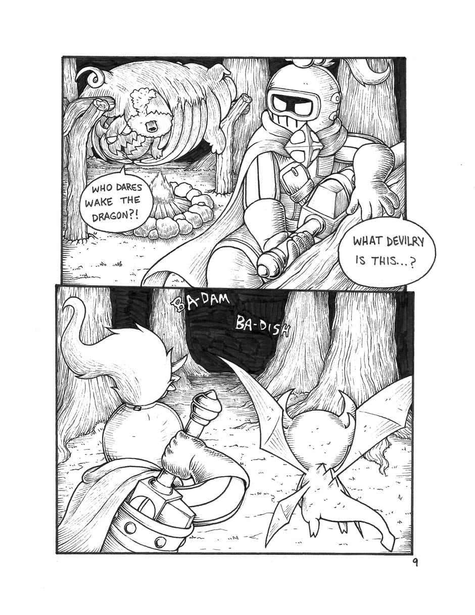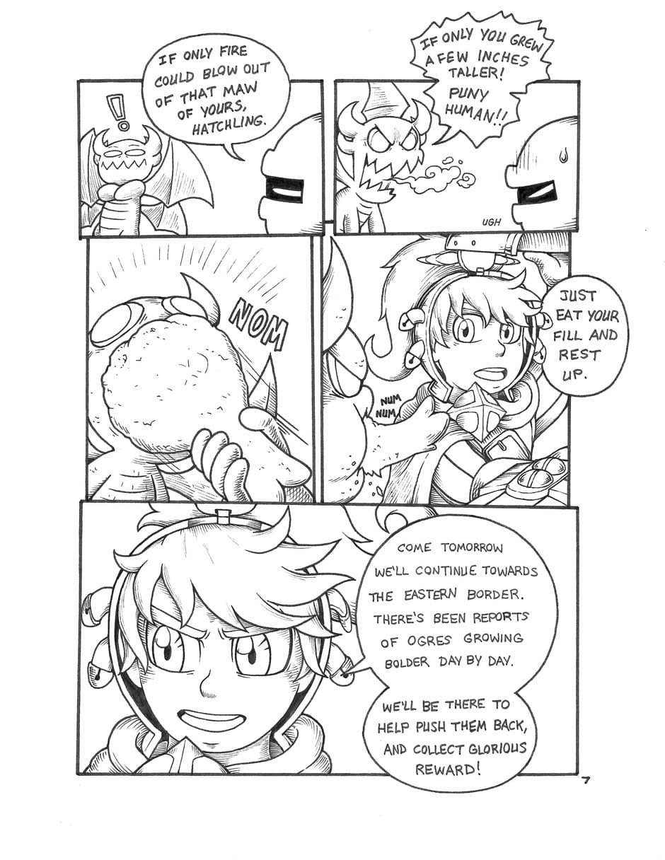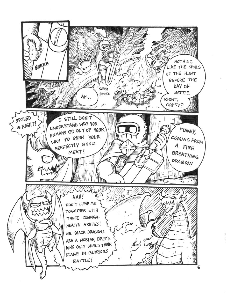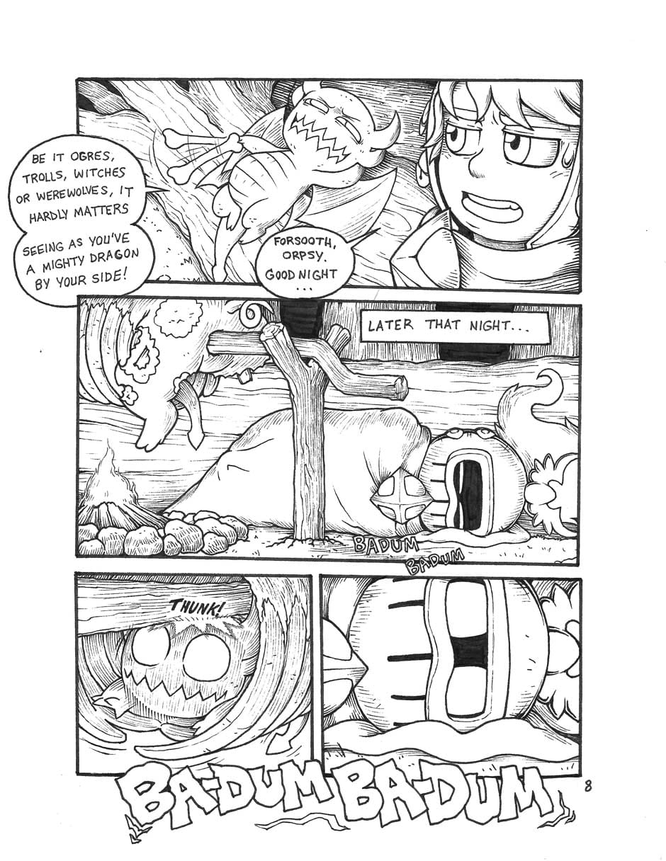 We meet our two heroes: A knight whose stout heart makes up for his short stature, and his fiery dragon companion Orpsy.