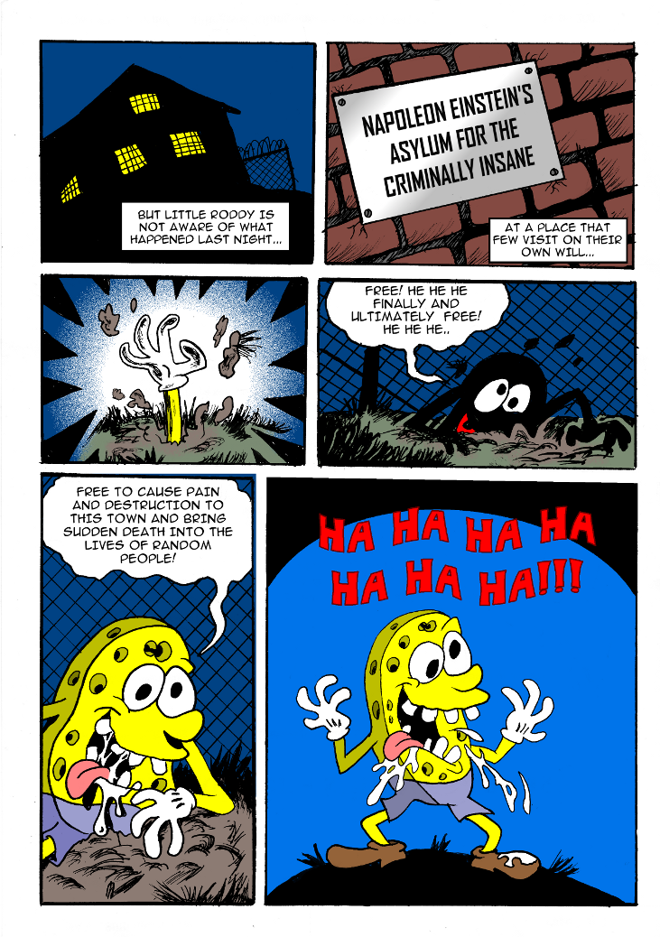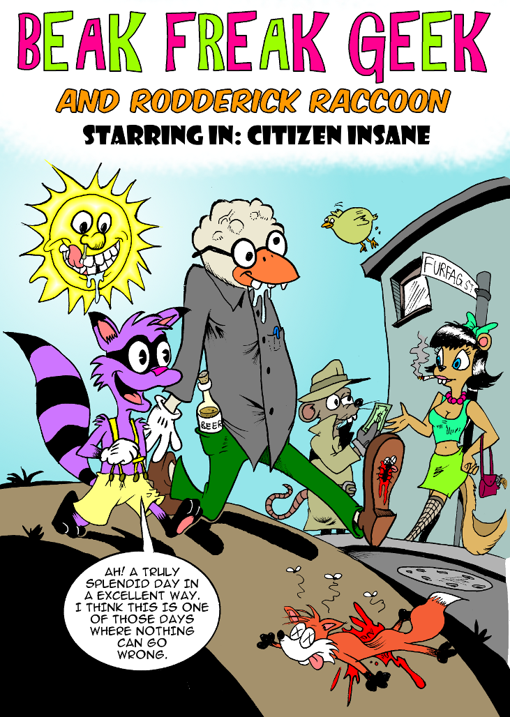 A purple raccoon and manbird are antagonized by a psychotic Spengbab-wannabe.