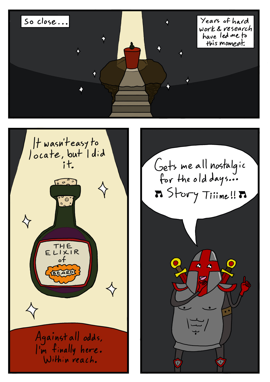 Lo! A new saga begins for our hero, Sir Sommet. What will the future hold for him and his quest for the Elixir of Beard? Well, we already know that he finds it, but I've always thought it was the journey that matters, not the destination. Cheers!