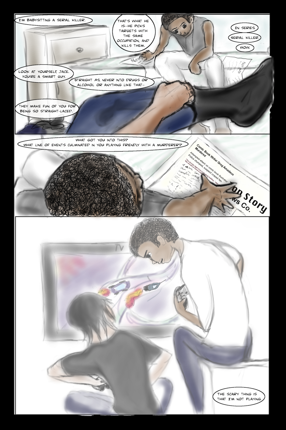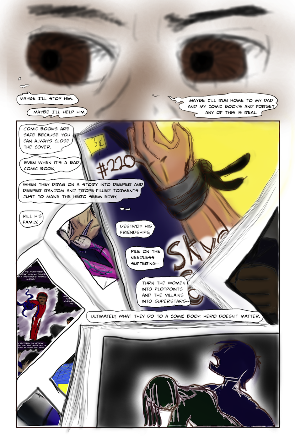 Comic book character out to shoot his author. Why? Join #blerd comics fan Jace as he traverses his collection of stories to find out--and figure out how to stop the murder. Together, you'll follow Asian-American superhero Skye and his team of Guardians through the whacky tales that make us love comics and the ugly tropes that make us hate them to answer the all-important question: if your author was responsible for all your mortal suffering, would killing him save your world, or damn your soul?