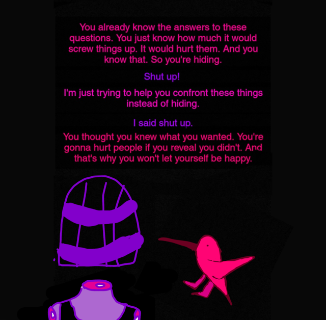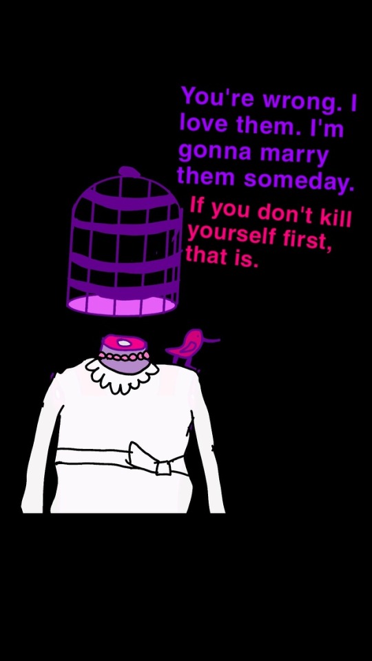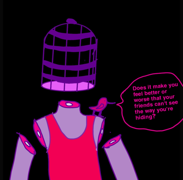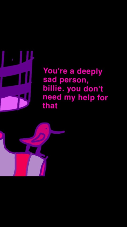 Billie Birdcage is a series of comics discussing the arguments between a girl named Billie, who is represented by a decapitated floating formation of purple body parts and a birdcage, and the inner voice in her head that tells the audience what she's really thinking despite often contradictory to what Billie says is true.