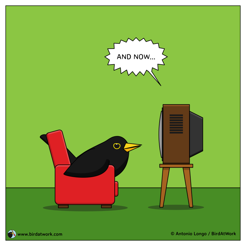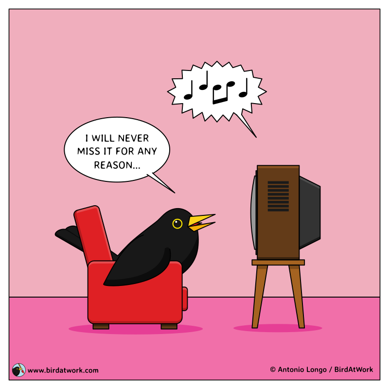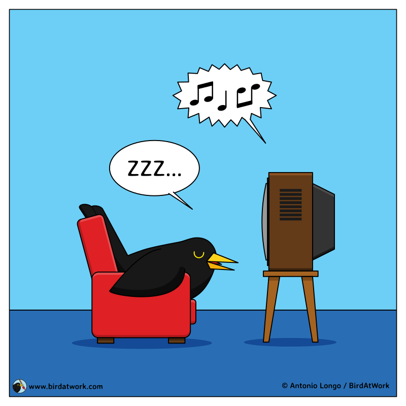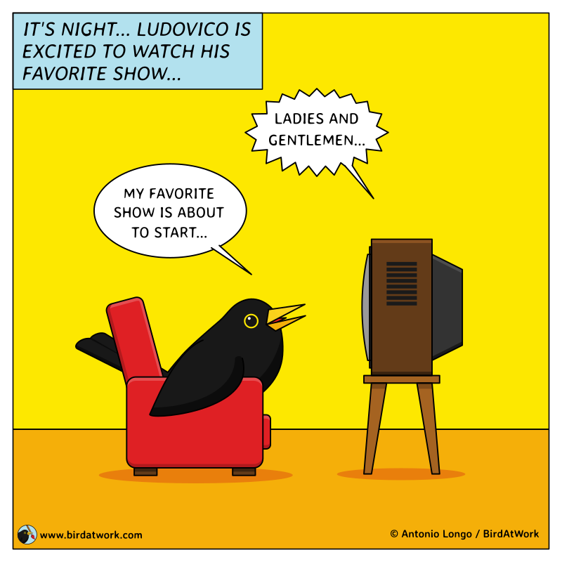 Has it ever happened to you to fall asleep in front of the TV? That happens to me sometimes. In this comic strip, Ludovico the Blackbird is excited to watch his favorite show but look what happened...