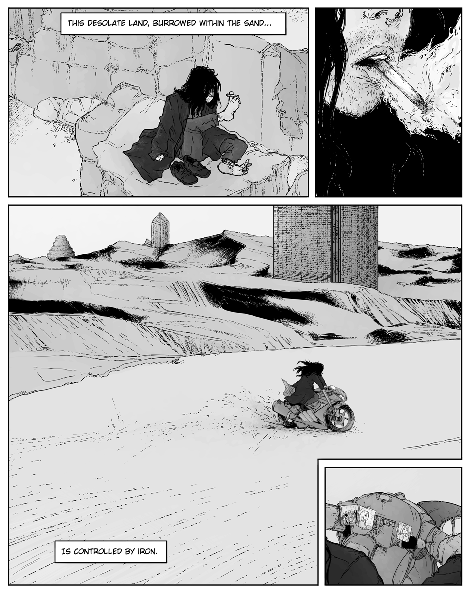 Man, yet again, stands alone within the darkness. Burrowed within the sand, is a tyrant, obsessed with magical iron. Dooming man to repeat their mistake of reaching to touch the heavens. Many have tried and failed to gain freedom from the bloodshed of an endless internal power struggle. Marie, an engineer that deserts the army, desperately attempts to flee from the shackles of the regime’s despotism and servitude.
