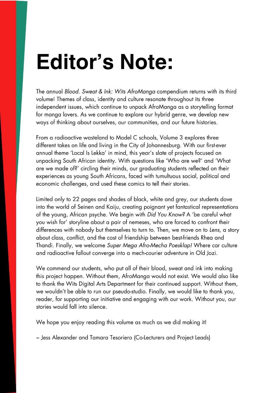 The annual Blood. Sweat & Ink: Wits AfroManga compendium returns with its third volume! Themes of class, identity and culture resonate throughout its three independent issues, which continue to unpack AfroManga as a storytelling format for manga lovers. As we continue to explore our hybrid genre, we develop new ways of thinking about ourselves, our communities, and our future histories.