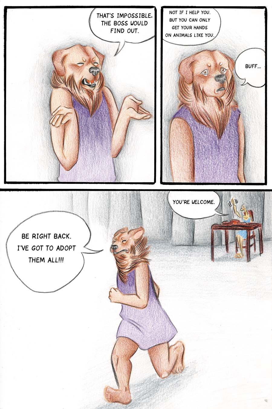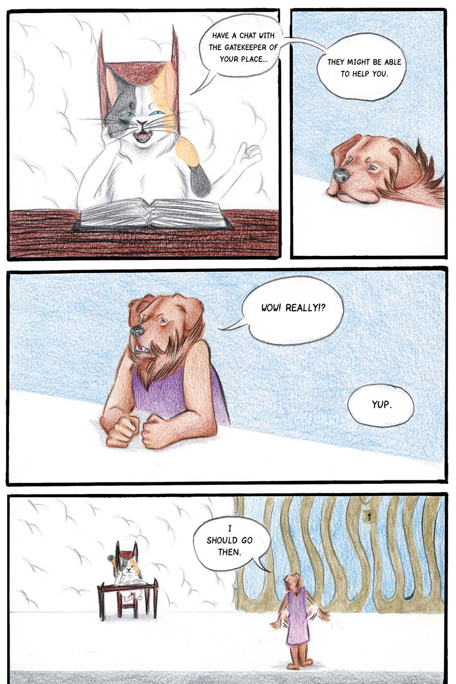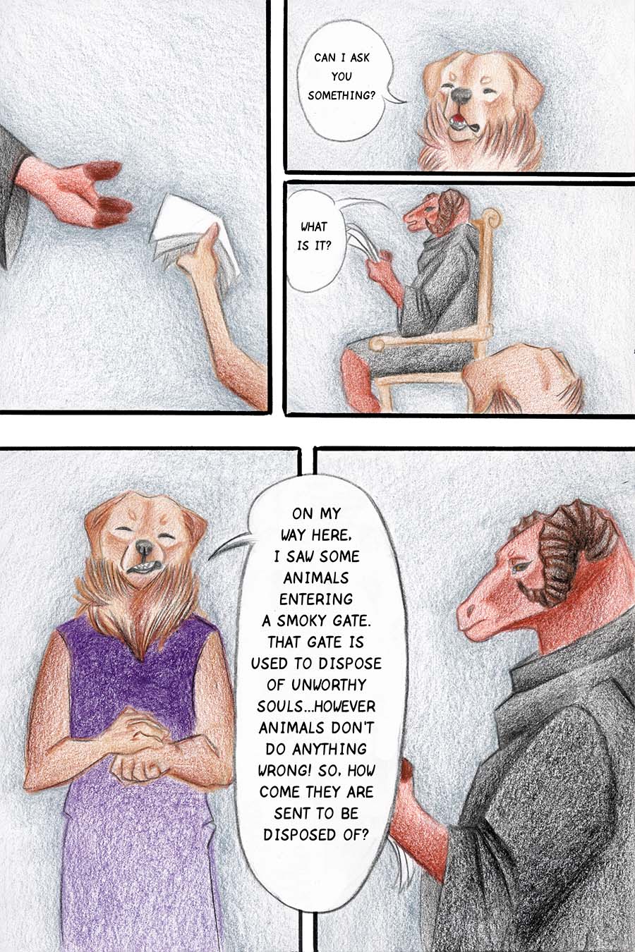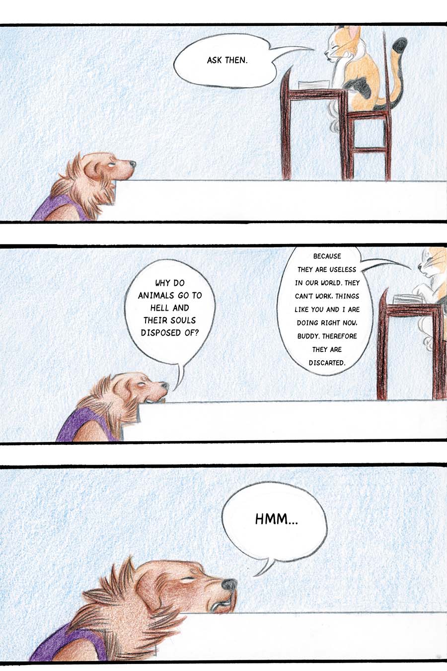Borkatory is a fun comic about Cookie, a Golden Retriever whom dislikes how the Underworld treats the souls of deceased animals. Cookie wants to know the reason behind their mistreatment and goes investigate this issue.