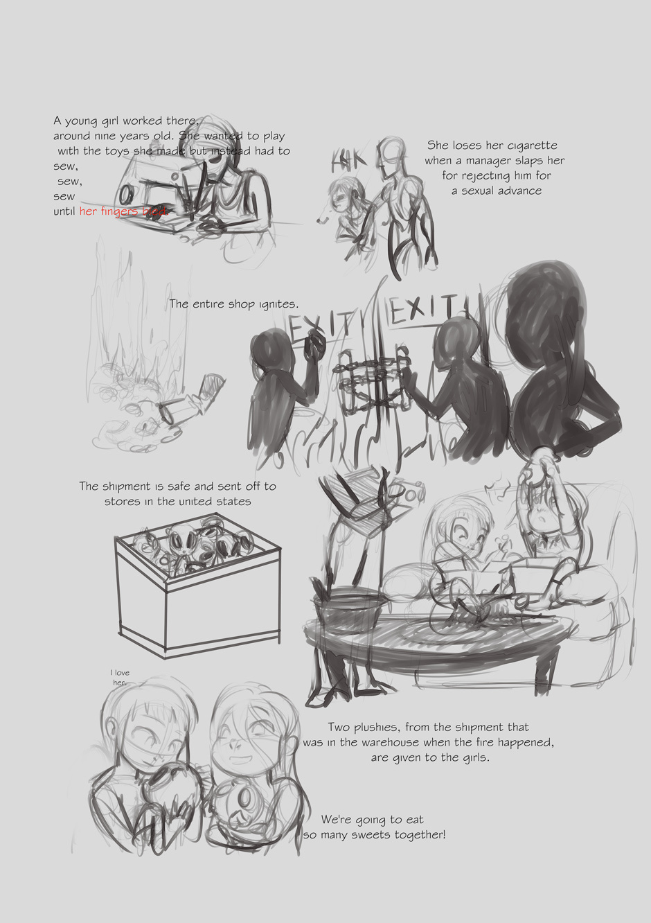 Brainstorming for the next Emma and Emi comic, I'd written a script before and now I'm just trying to visualize how some of it would play out. Very rough at this stage, just trying to get a feel for what sort of things I'll need to draw. I don't think in the actual comic I'll reveal the backstory in the beginning, I'll probably parse it out as a mystery during the comic. Through nightmare sequences perhaps?