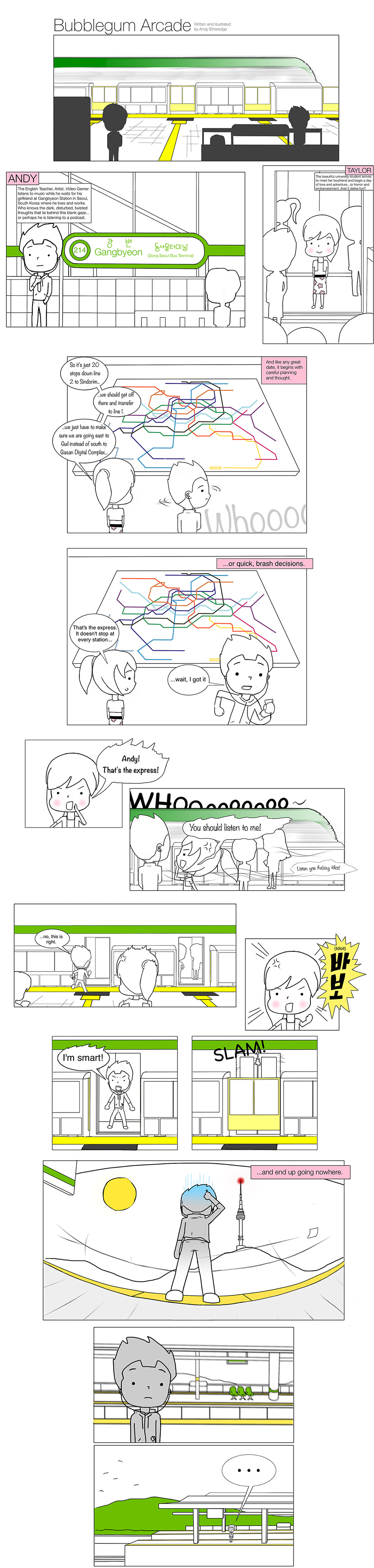 The adventures of Taylor and Andy in South Korea. Follow them as their normal, everyday lives unfold with unpredictable insanity. A world where bunnies build spaceships, Death lives in an apartment, and couples argue over a package of chips. Nothing is ordinary in the world of Bubblegum Arcade!