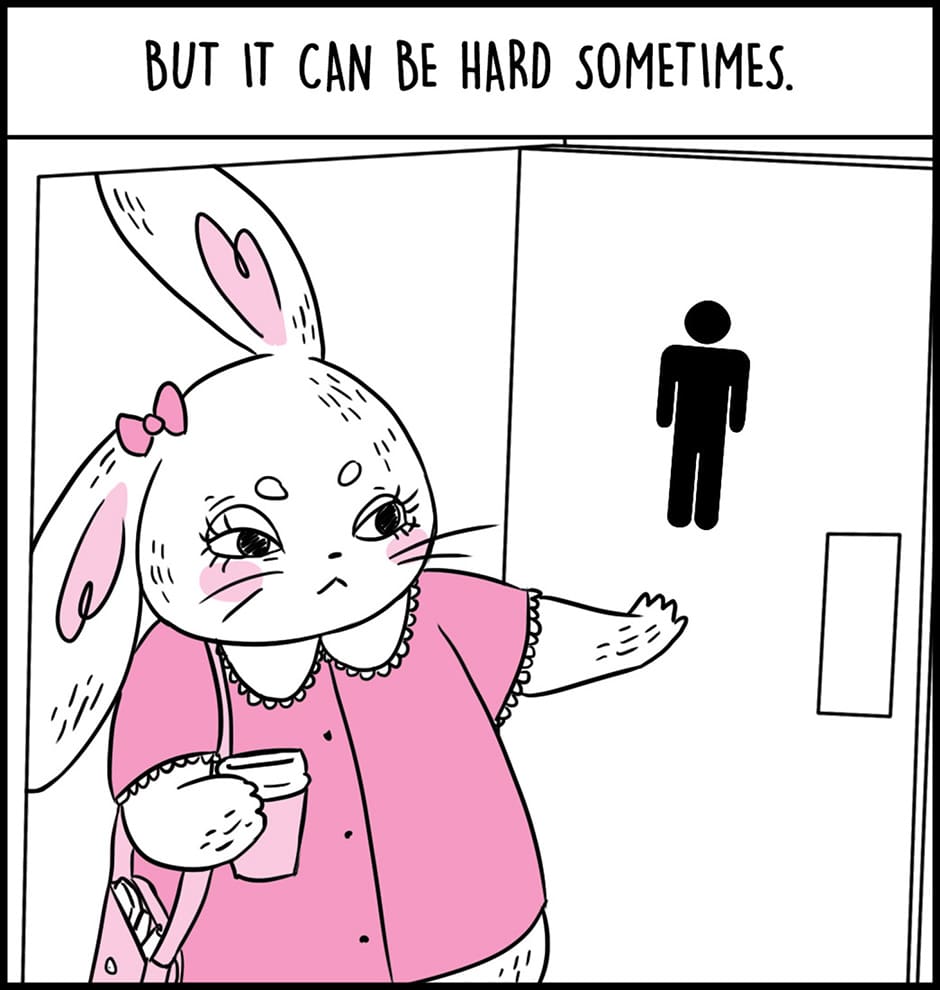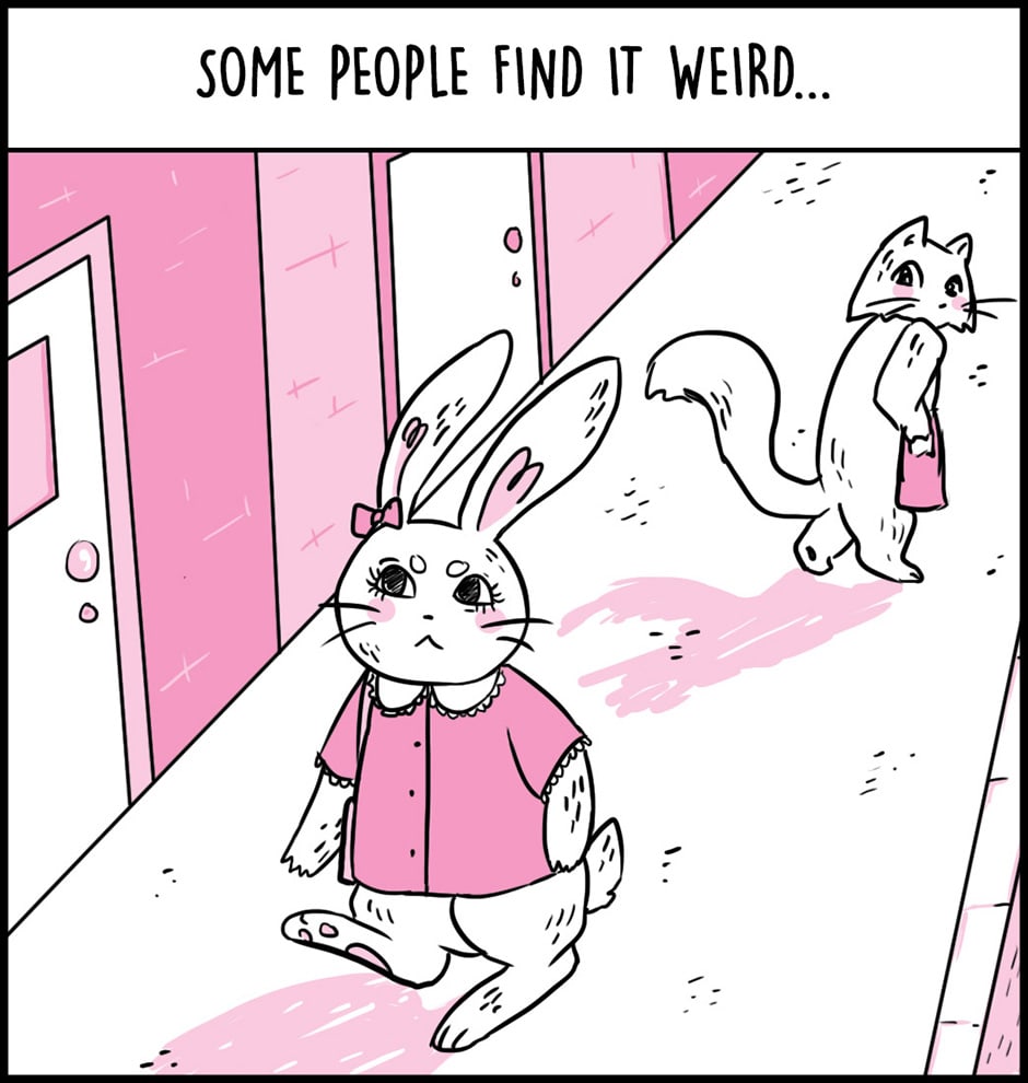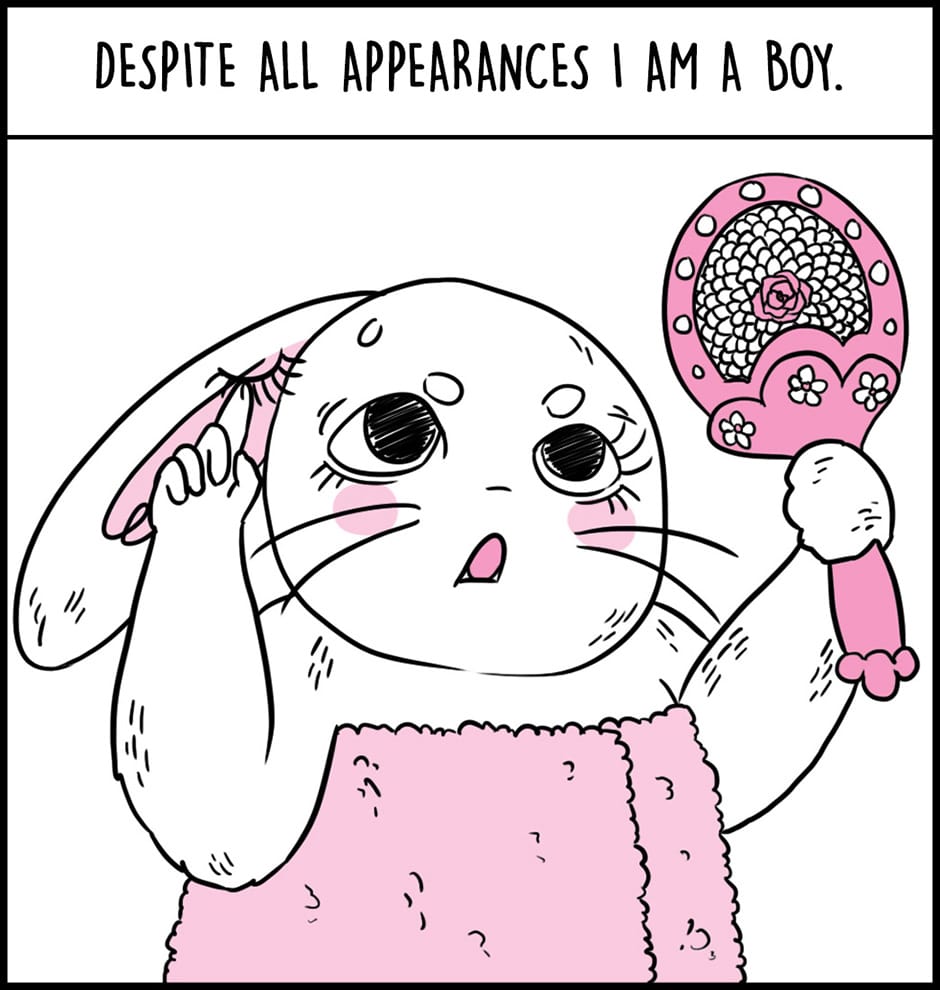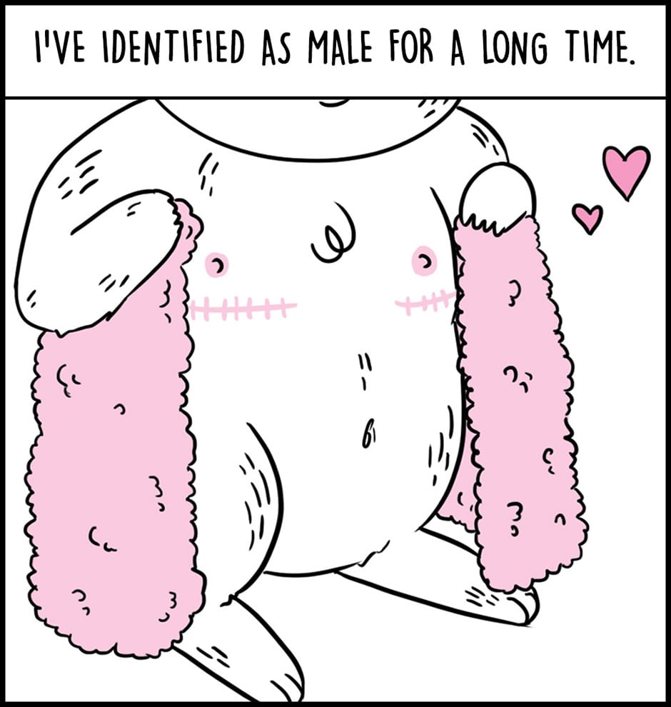 Bunny is a comic that explores gender presentation from the perspective of a feminine transmasc male identifying rabbit, Bunny.