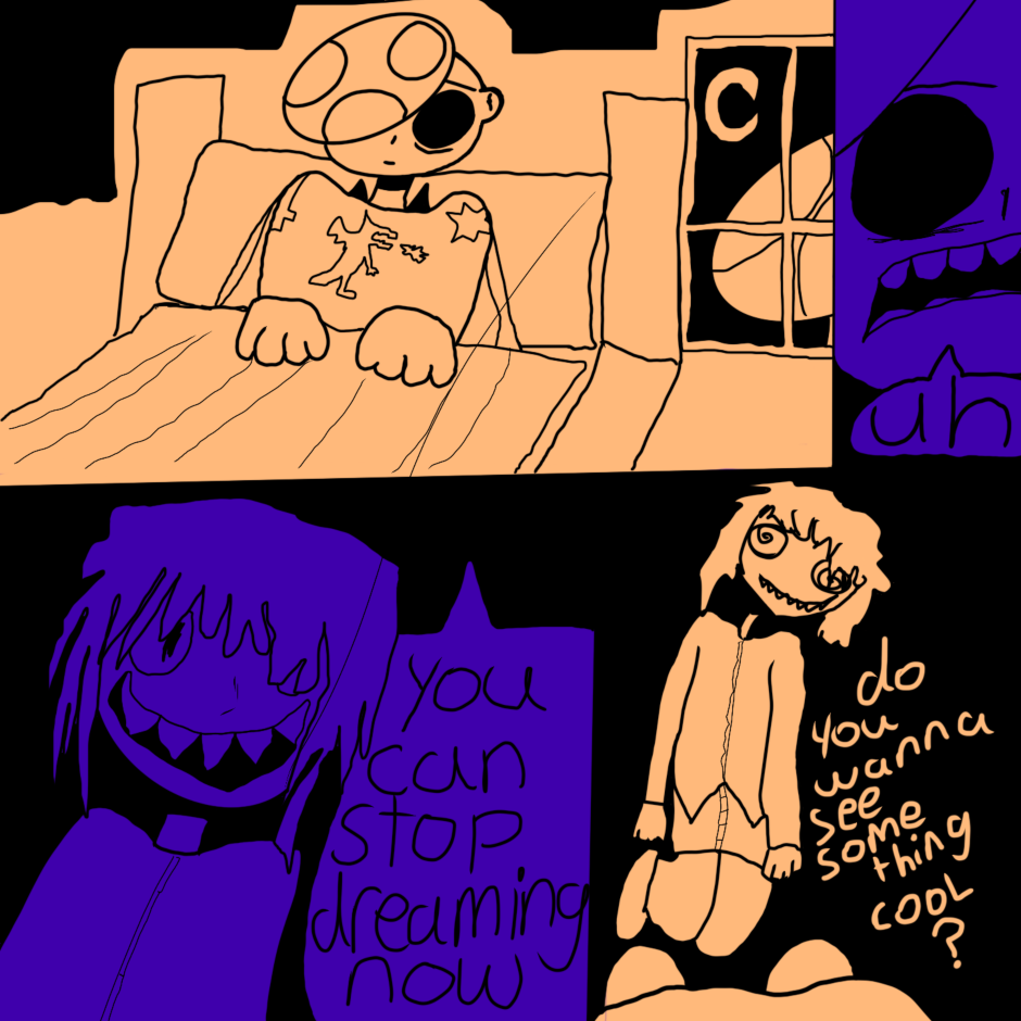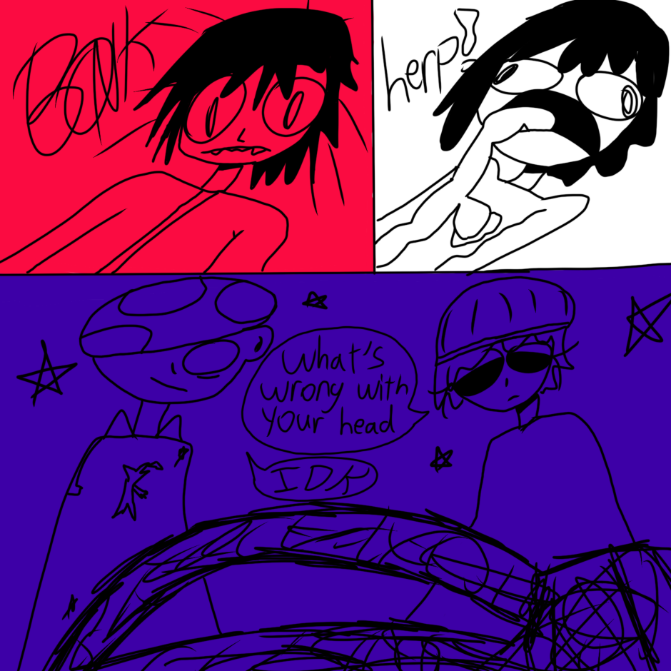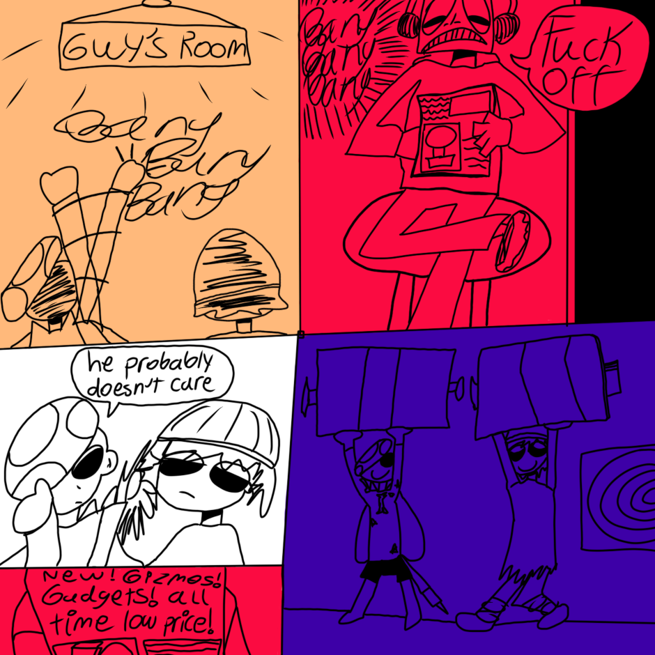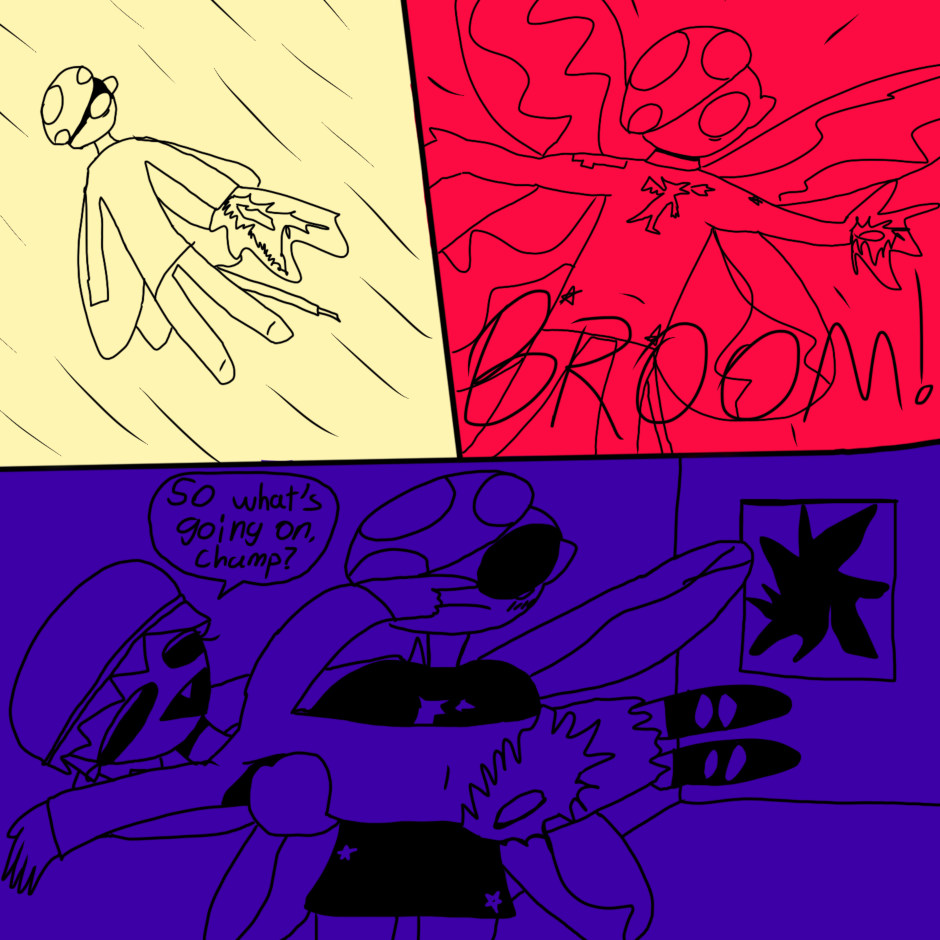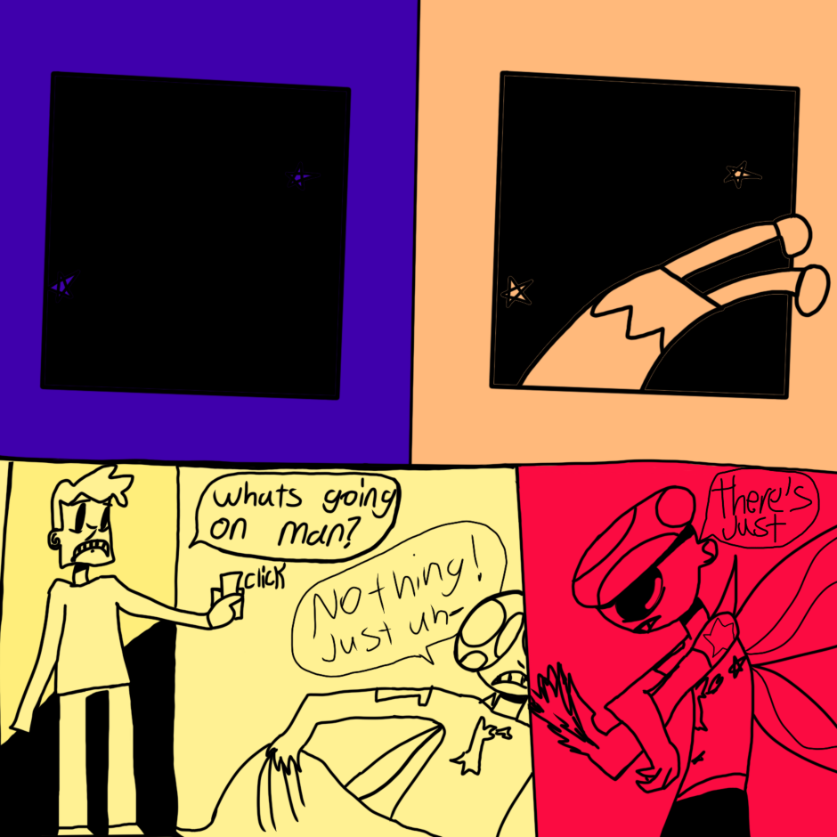 butterfly boy is a boy with butterfly wings who lives with his 2 roommates (Cate and Guy) in a surreal, dreamlike world where they are haunted and generally harassed by ghosts. while not much explicitly gay happens this comic is mostly an expression of my queer identity in an abstract/humorous way