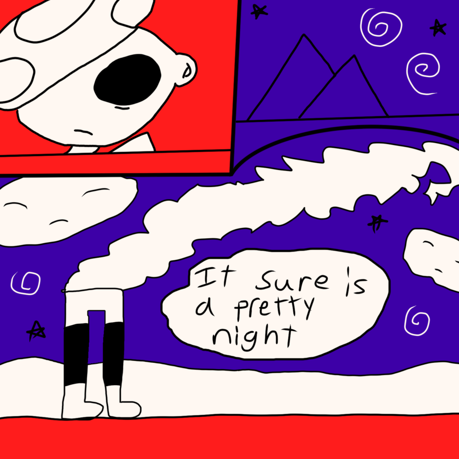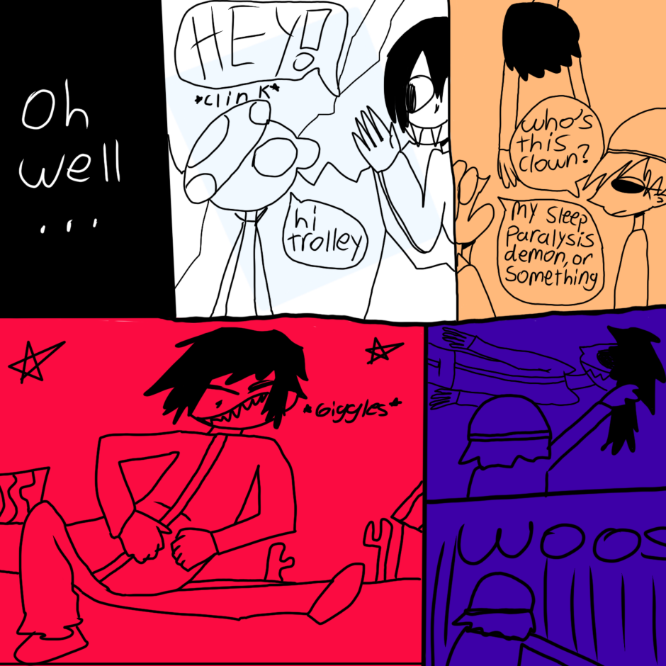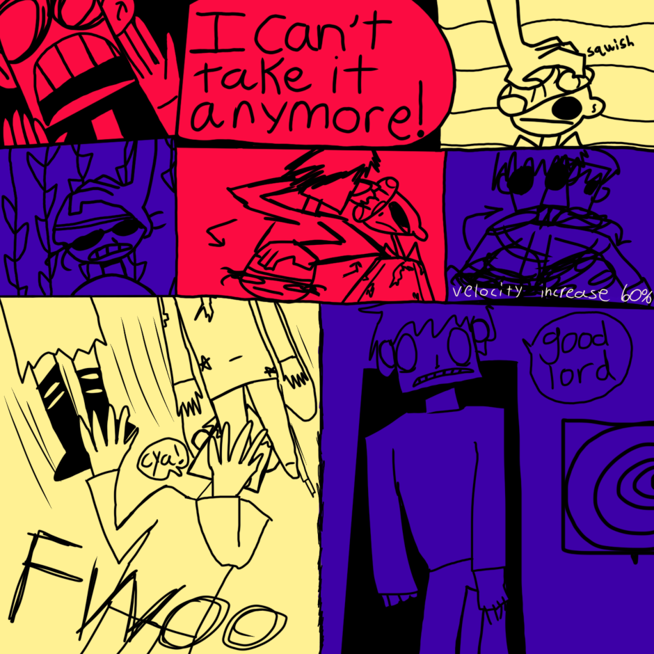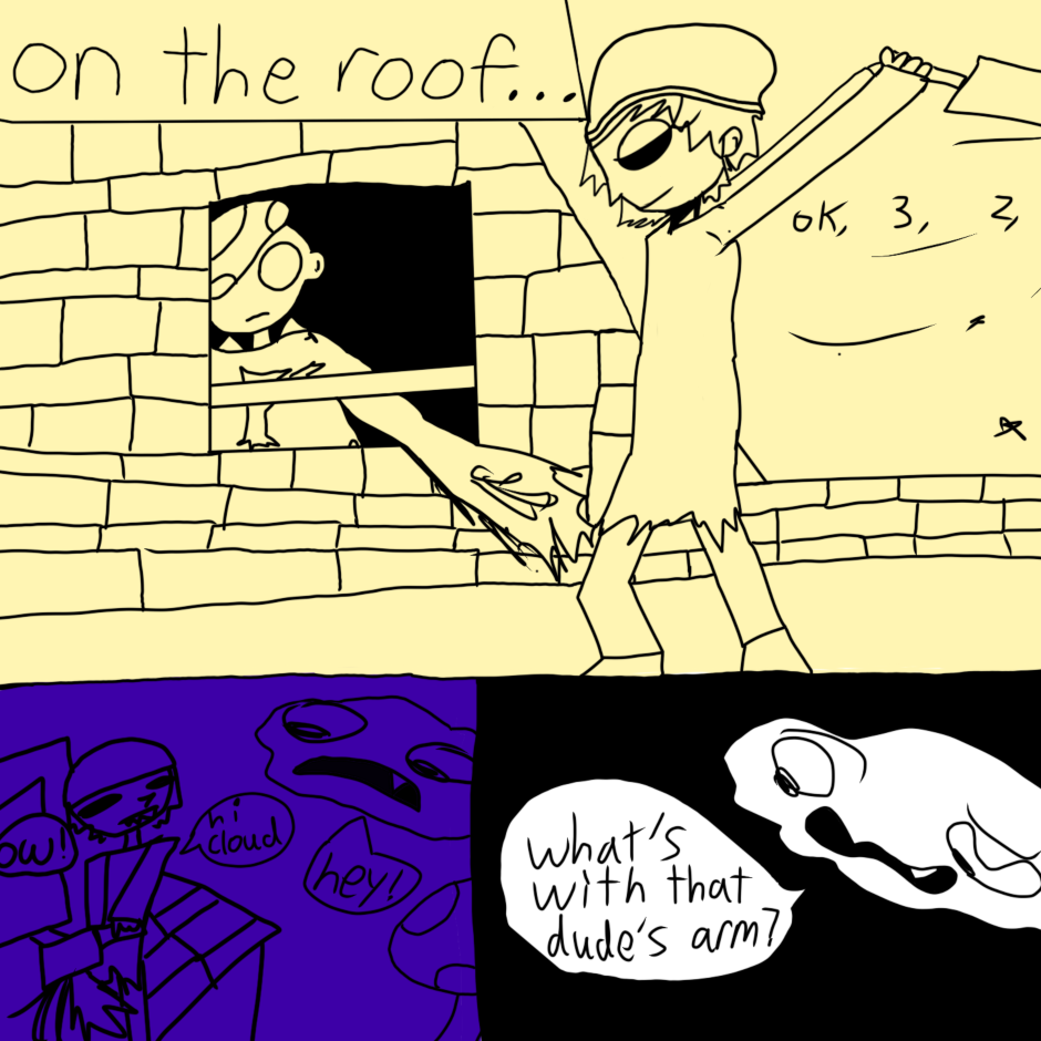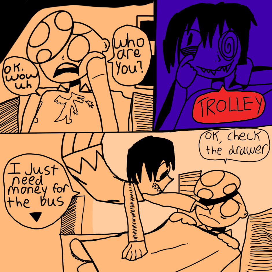 butterfly boy is a boy with butterfly wings who lives with his 2 roommates (Cate and Guy) in a surreal, dreamlike world where they are haunted and generally harassed by ghosts. while not much explicitly gay happens this comic is mostly an expression of my queer identity in an abstract/humorous way