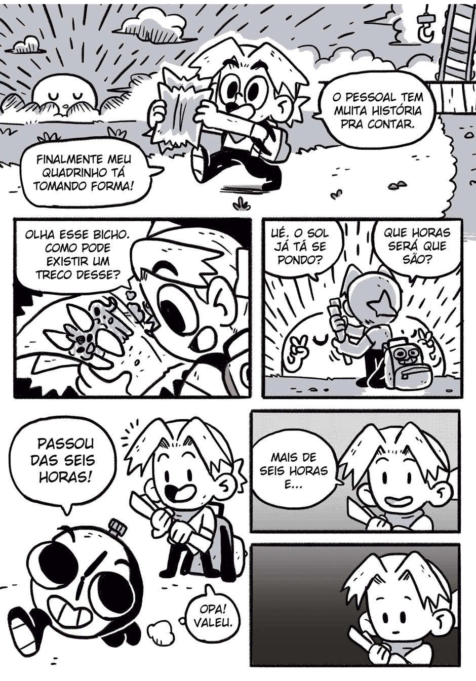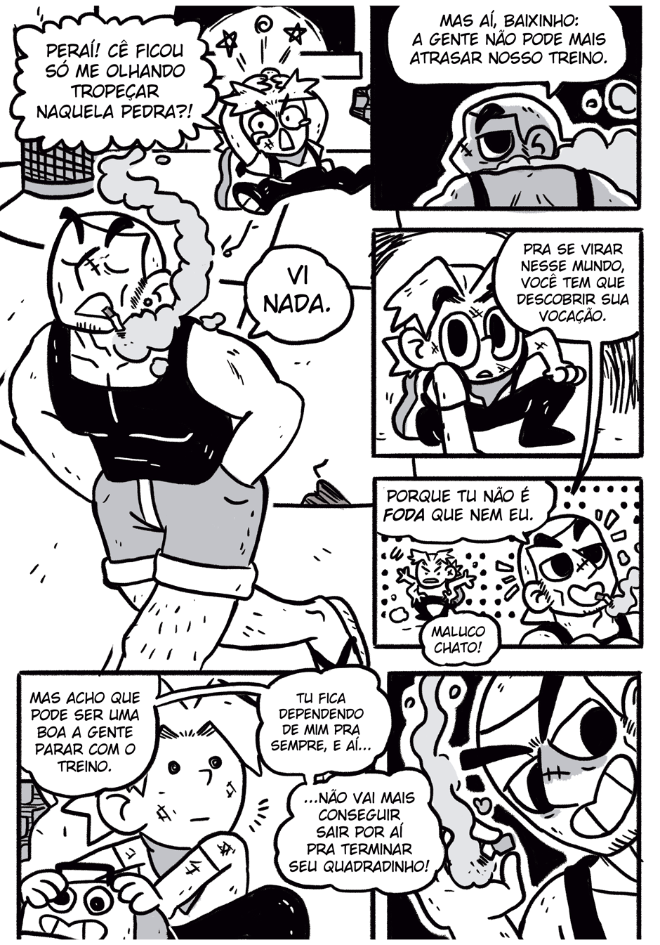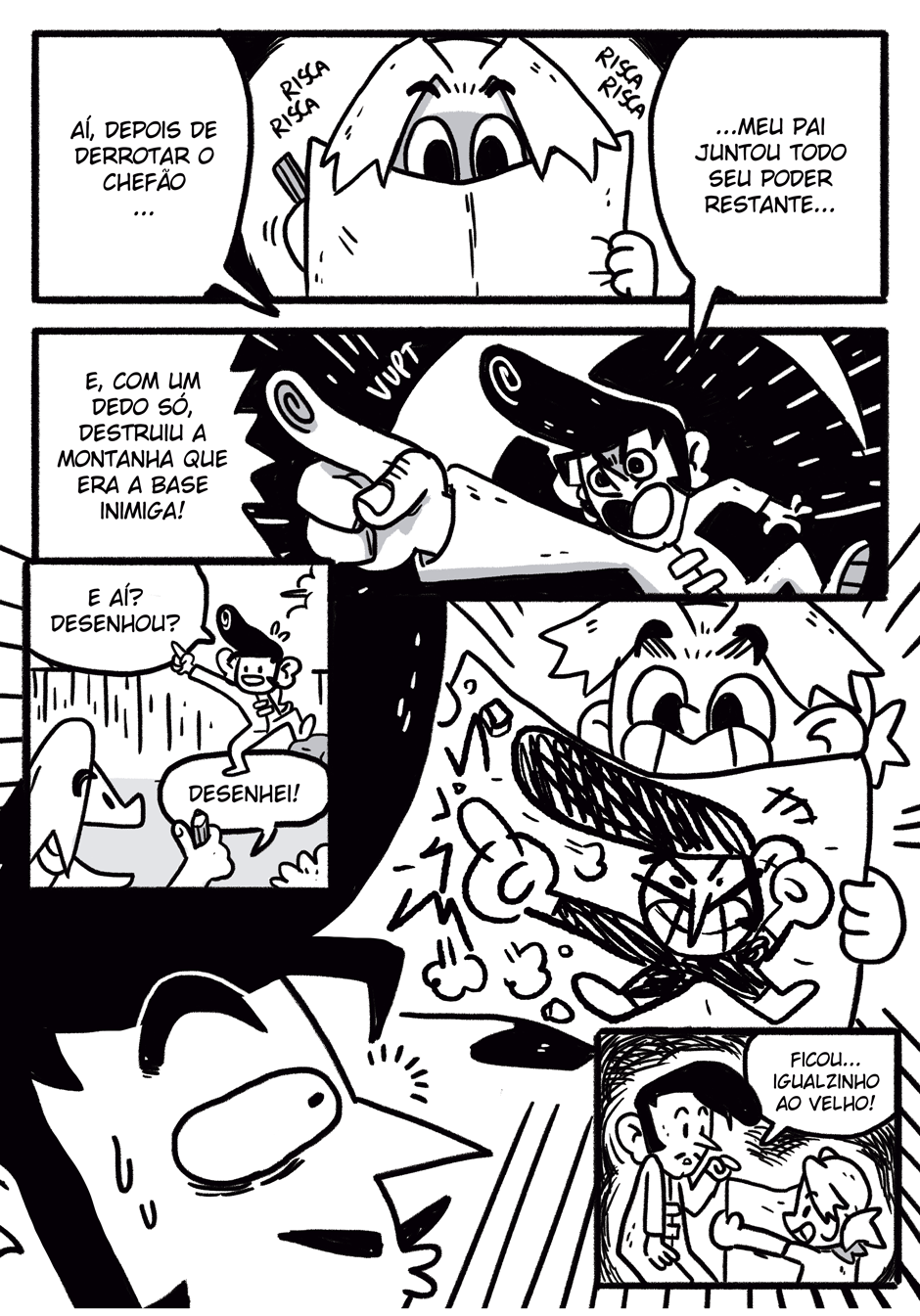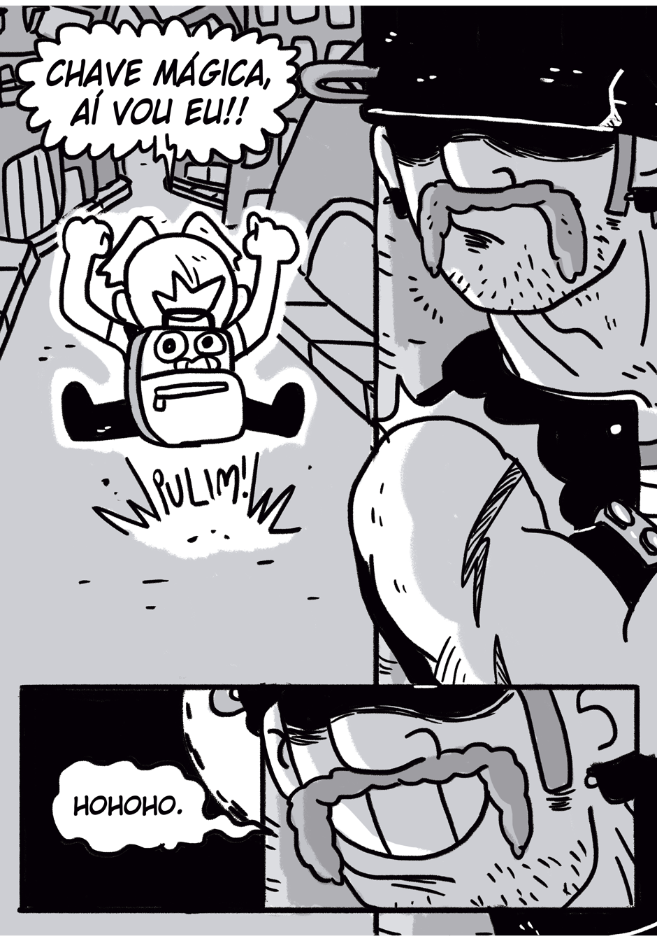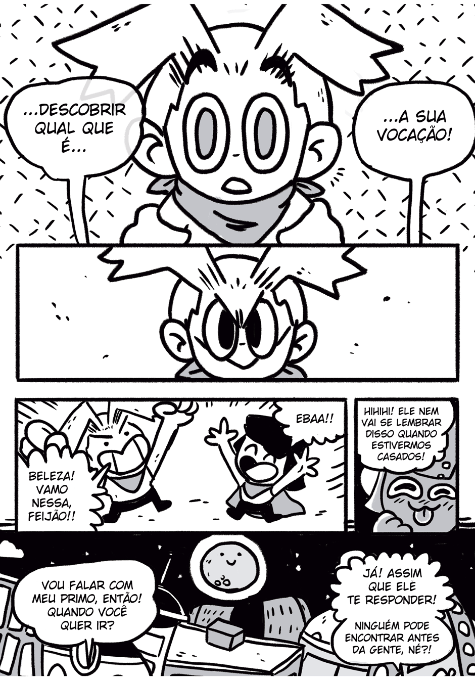 Teus quadrinhos tem uma coisa caótica que é muito massa, curti a história e me lembrou coisas de dr slump e produções da trigger, continue que tá muito engraçado e divertido hauahauaha